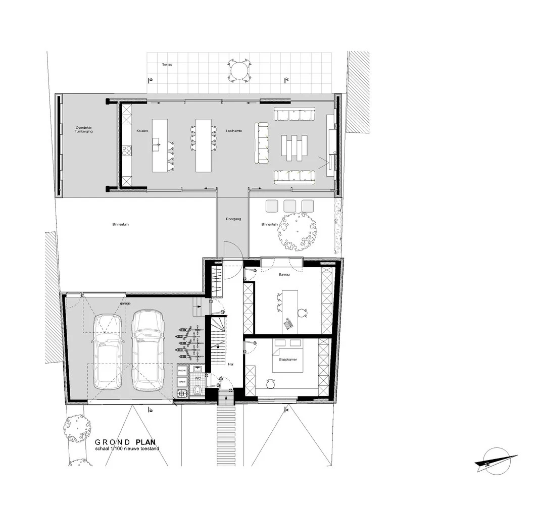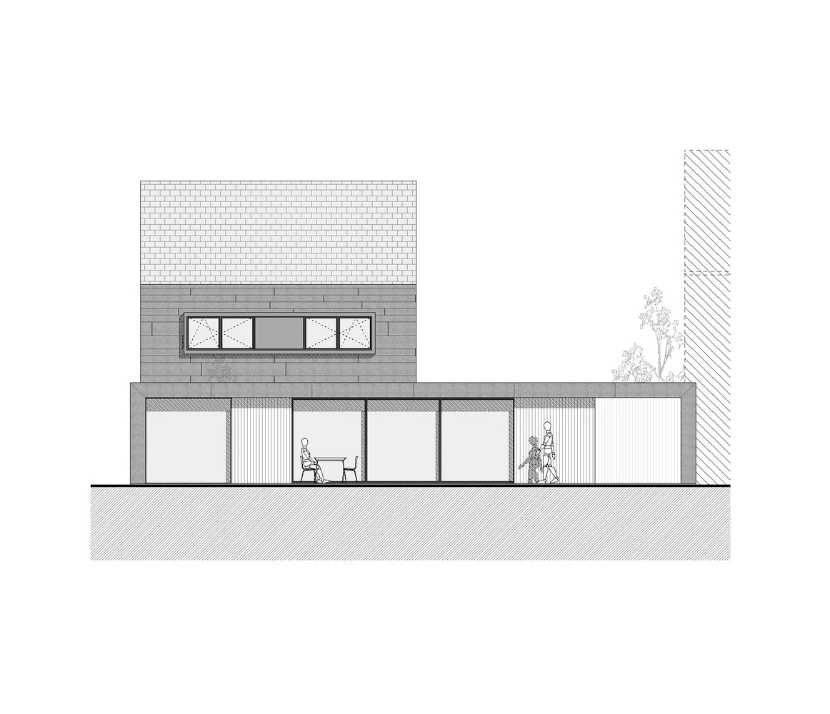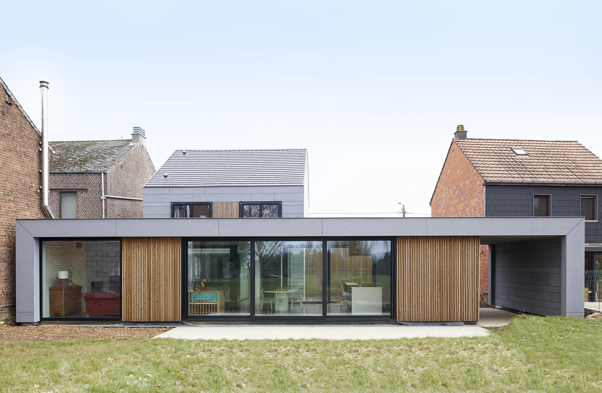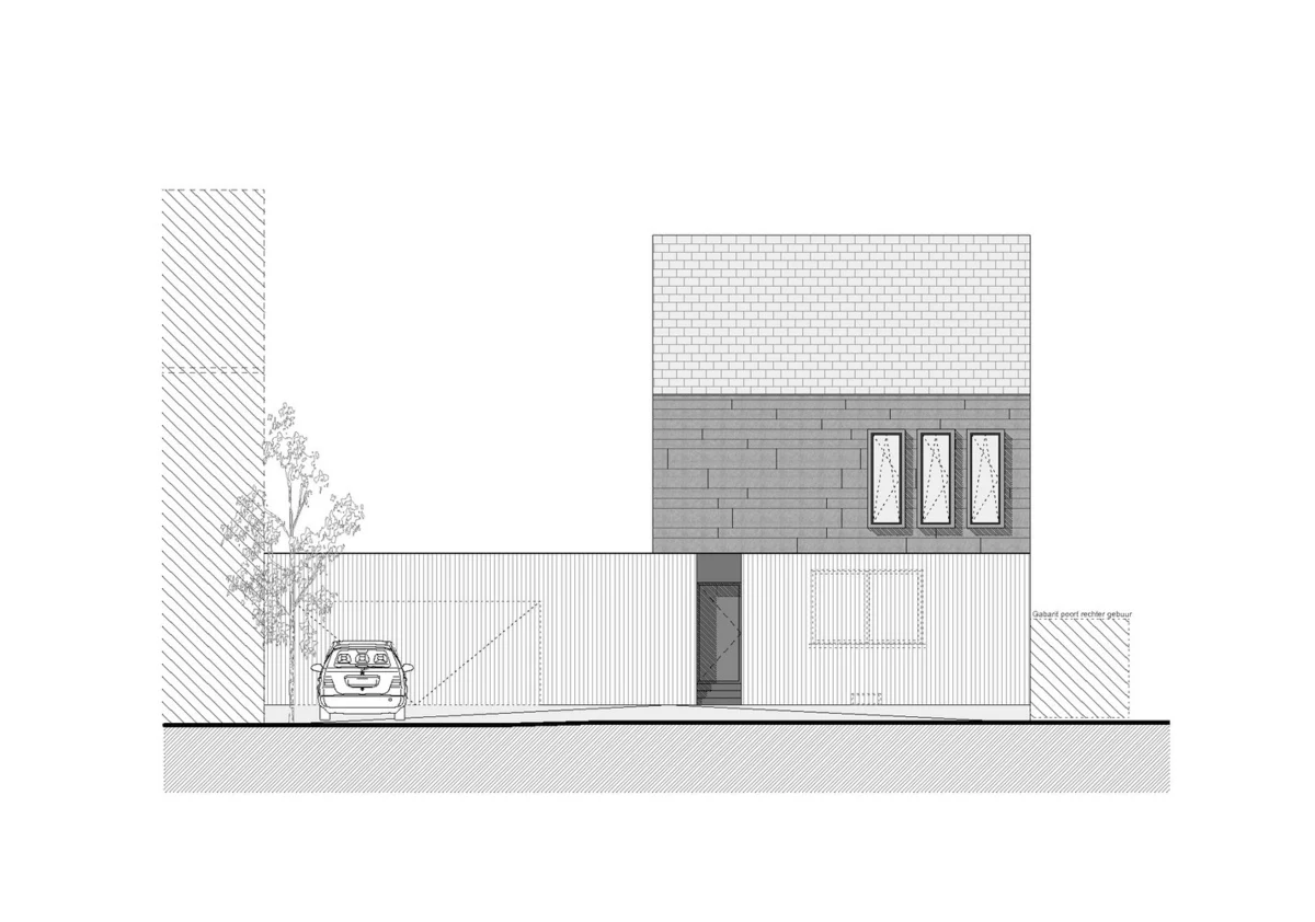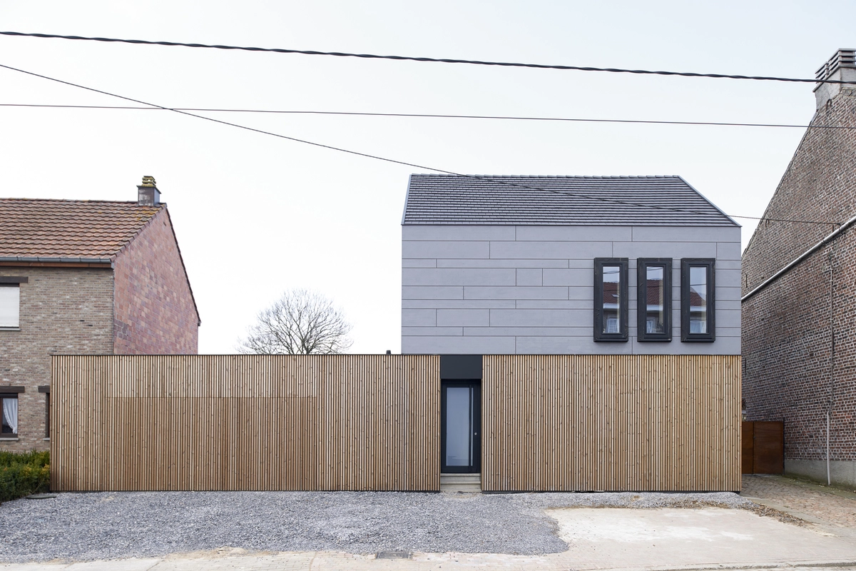 Respecto a los materiales, Van Impe optó por revestimientos de madera y fibrocemento. Los listones de Thermowood en la planta baja potencian la verticalidad, al tiempo que garantizan un envejecimiento uniforme. En cuanto al primer piso, se escogió un acabado gris y un dibujo de paneles horizontales con patrón aleatorio para equilibrar las proporciones del edificio.