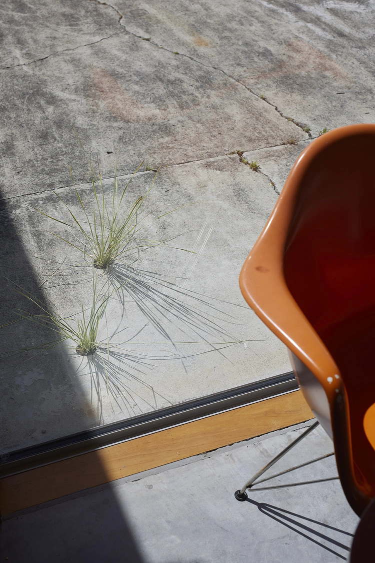 La casa se organiza en franjas —o “carriles”— delimitadas por cerchas de cubierta, generando una secuencia ordenada de espacios sin rigideces. Al acceso posterior, la fachada se muestra cerrada, casi austera. Pero hacia el antiguo vaso de la piscina —convertido ahora en un jardín hundido—, la vivienda se abre por completo con superficies acristaladas que inundan el interior de luz y ofrecen vistas profundas. Una pequeña piscina auxiliar se ha conservado para su uso en verano, añadiendo un guiño lúdico al conjunto.