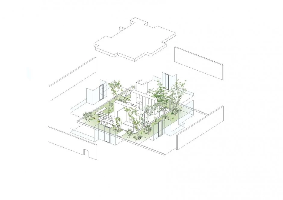 Se comenzó con un muro exterior flotante de 2.4m se alza casi 1m por encima del nivel del suelo, confiriendo privacidad de los viandantes pero permitiendo que la luz ilumine el espacio desde abajo. Una plataforma de madera de abedul se inserta dentro de las particiones de vidrio para que cada espacio se rodee de un anillo verde iluminado, que exhibe las condiciones exteriores y que cambia con cada estación.