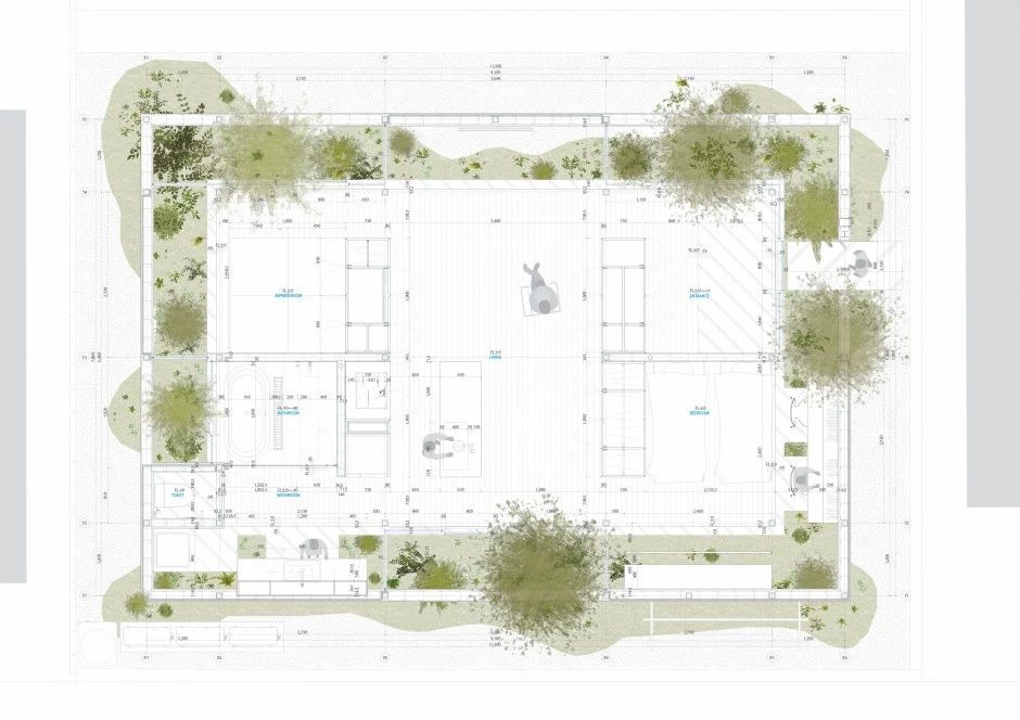 La vivienda se levanta sobre una parcela con un ligero desnivel; al norte linda con las montañas y al sur, con las vistas a a la ciudad. Aún asi, fue difícil averiguar las características de la parcela ya que se trata de una zona residencial con hileras de casas. La privacidad , por tanto, era un aspecto necesario e importante en el diseño de la casa. Los arquitectos jugaron con la idea de un jardín para obtener luz natural aunque no pudieron proteger los espacios de las miradas exteriores. El jardin se hizo lineal para abrazar el perímetro del proyecto -un anillo hecho de piedras y varias especies de plantas-.