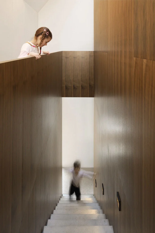 El plano diáfano permite el aprovechamiento de metros en la zona de estar, cumpliendo los deseos de una vivienda multigeneracional. El corazón interior es un muro de madera que sirve de guía en el hueco de escalera y conecta las diferentes alturas; se extiende hasta la cubierta y se enreda con el piso superior. A su espalda, se recorta un gran espacio que se abre al baño. La ausencia de puertas acentúa la fluidez del diseño del plano.