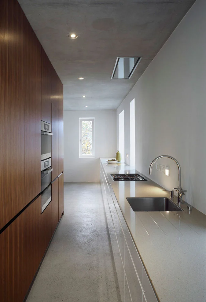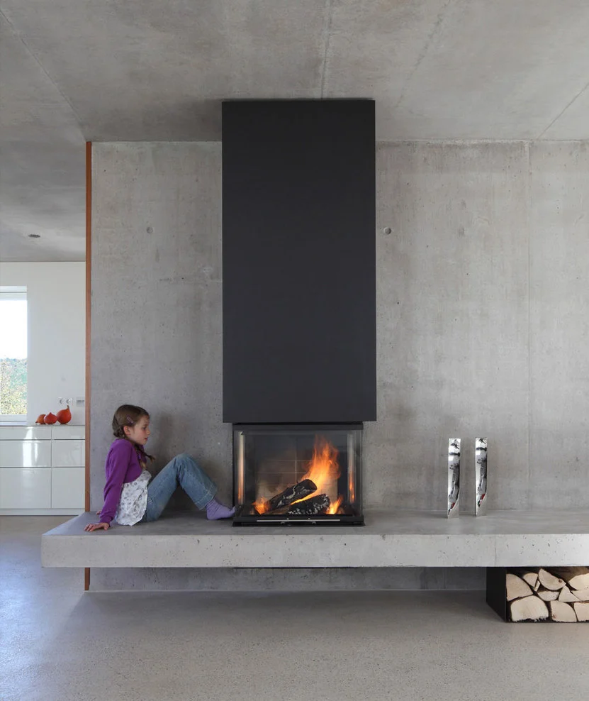 Pocos materiales aunque cuidadosamente seleccionados realzan el concepto de espacio abierto; el solado de hormigón crudo complementa el uso de la madera de nogal. En el salón, la pared de hormigón visto altera el corazón y parece que sostiene una chimenea flotante.