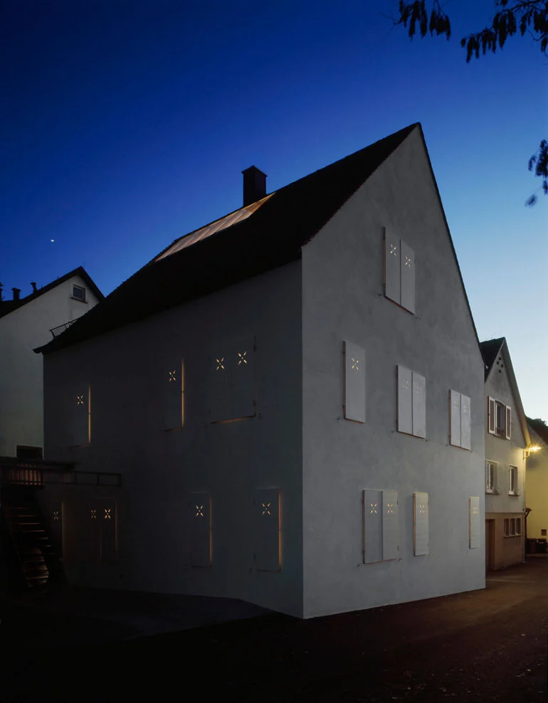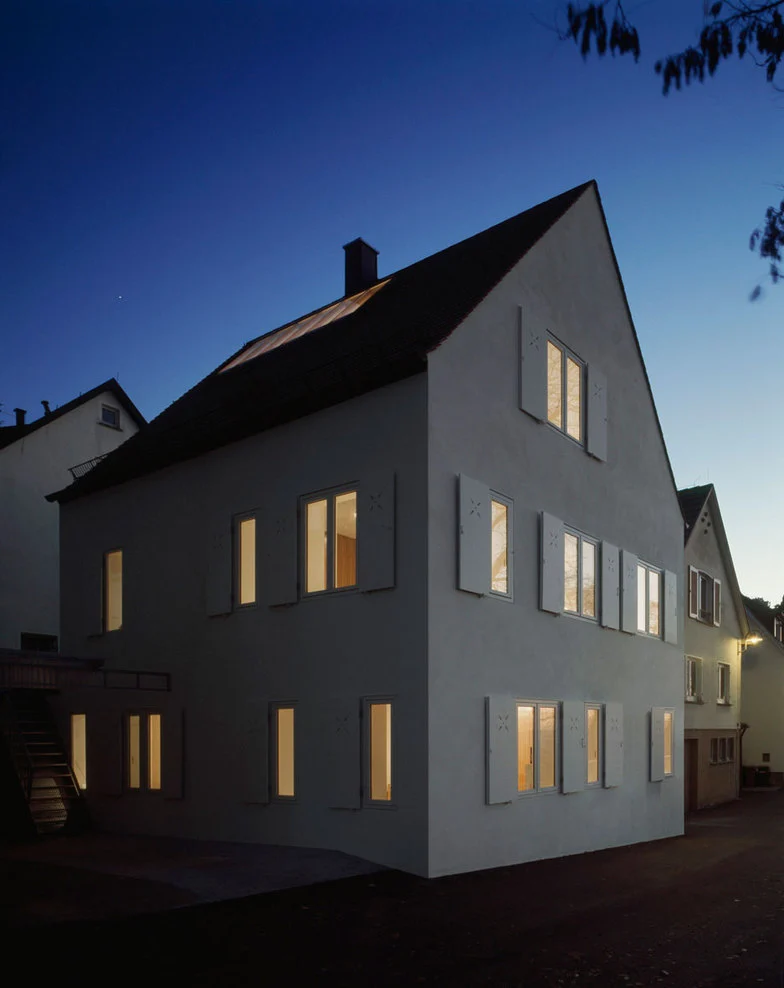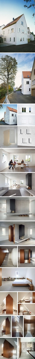 En un entorno culturalmente protegido, a los pies de los viñedos de Rotemberg (Alemania), se ubica esta vivienda propiedad de un matrimonio jóven. Las limiticiones para la construccion de edificios y las dificultades en el suelo fueron inicialmentente un gran obstáculo y condicionaron los deseos de los propietarios. A pesar de las estrictas limitaciones, surgió una vivienda pura, con detalles modestos y referencias a la tradición de los edificios antiguos. El envoltorio de la vivienda es completamente blanco para cumplir con las demandas de la conservación de edificios históricos y para resaltar su «nueva cara»; un formato común para todas las ventanas, con contraventanas de elementos limpios abren la fachada y sirven de marco a las vistas sobre los viñedos. Los elementos decorativos de las contraventanas conectan la nueva vivienda con la anterior.