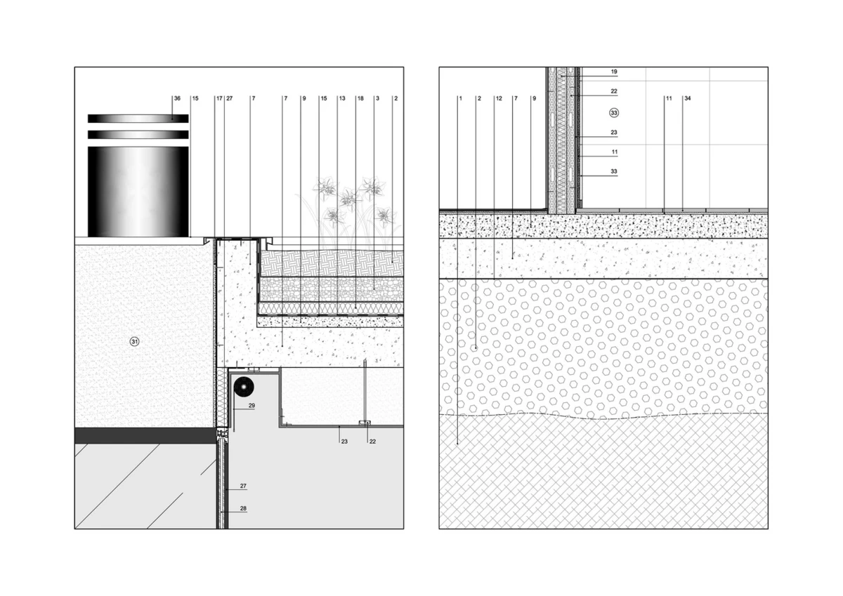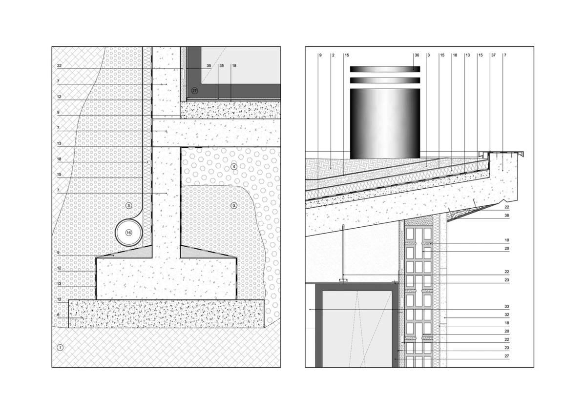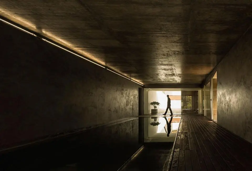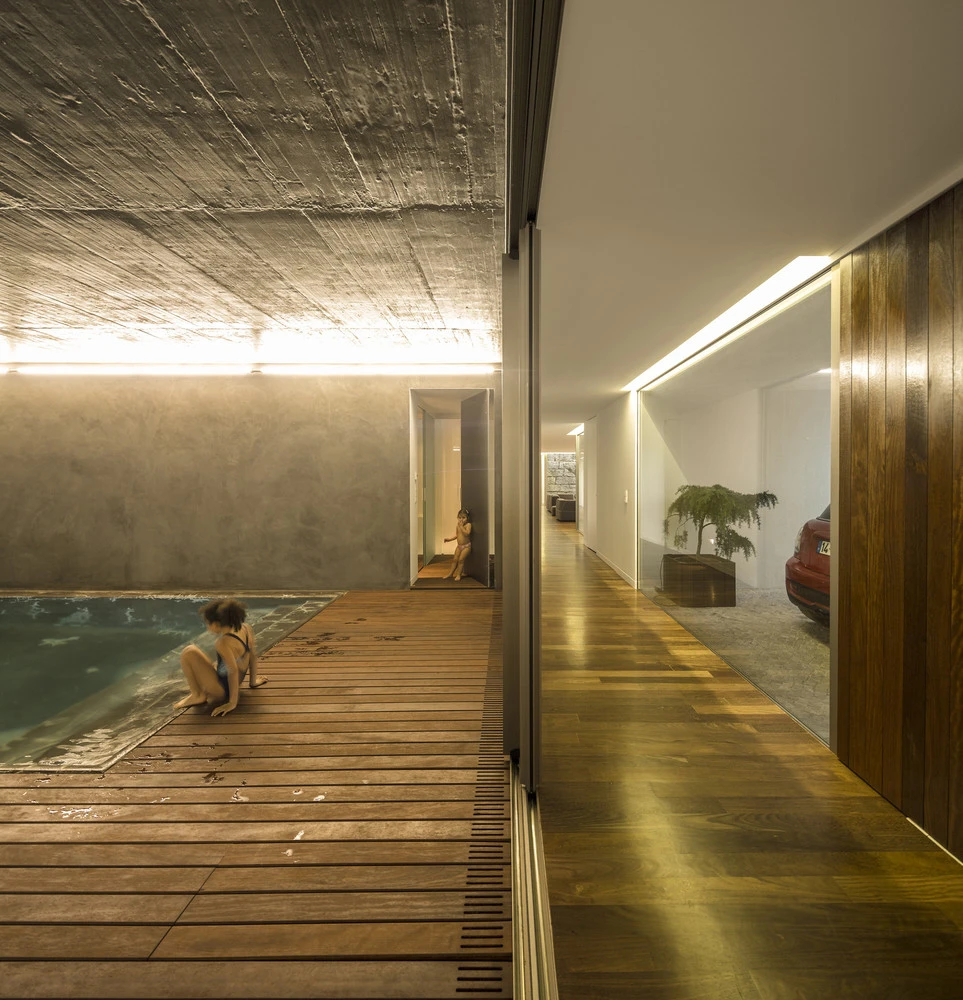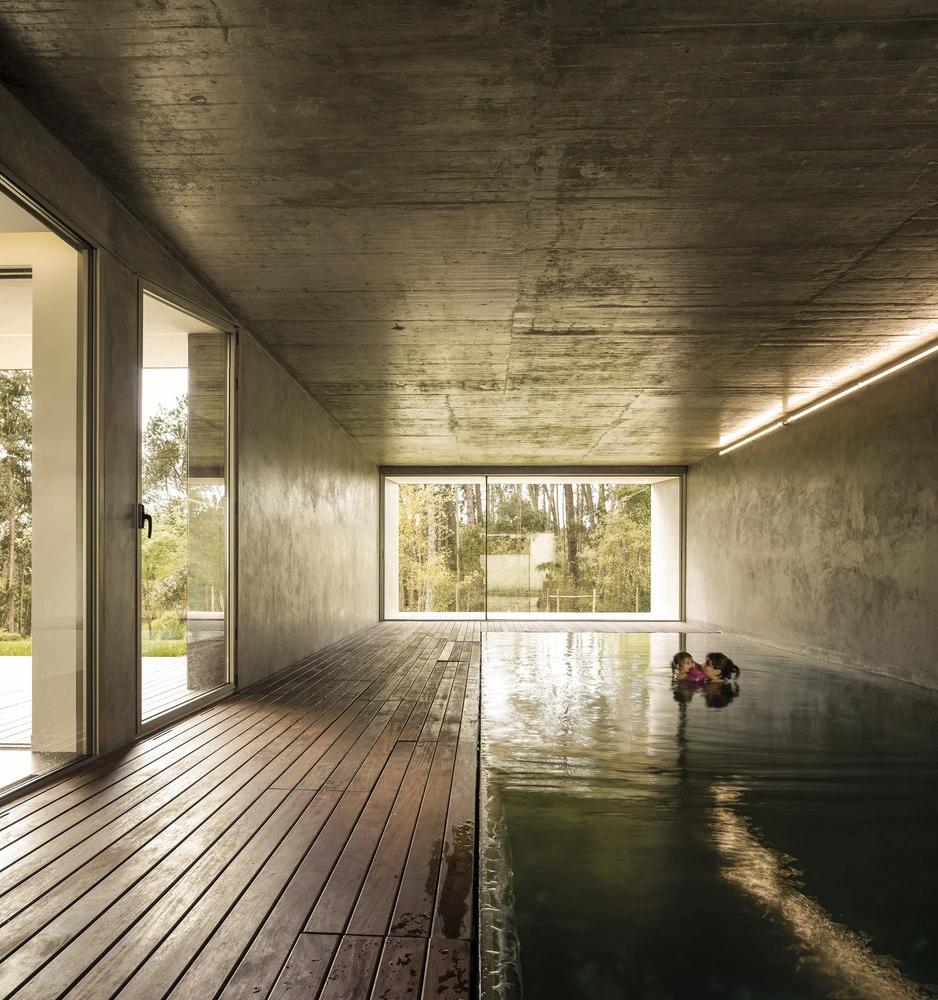 Como nexo de unión entre ambos frentes, una larga y estrecha piscina cubierta atraviesa la vivienda, prolongándose hacia el jardín, de manera que la luz y las formas exteriores se reflejan en ella como si fuese un espejo. Al igual que el resto de la casa, sus volúmenes externos están revestidos de corcho, un material que procura un aislamiento térmico eficaz a la estructura de hormigón, así como una textura agradable al tacto y a la vista, que favorece su fusión con el paisaje.