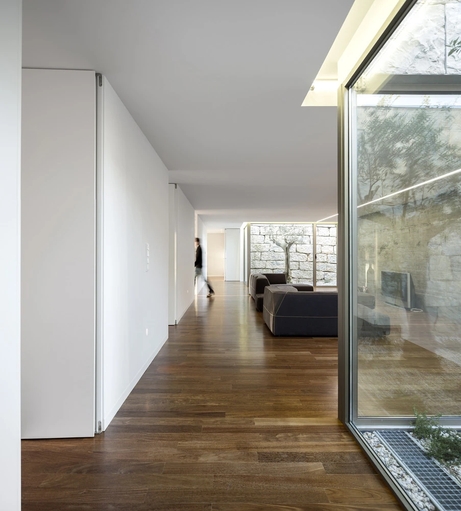 Un gran pasillo central vertebra de norte a sur el interior de la casa, finalizando en un amplio salón con cocina a un lado y terraza cubierta al otro. La propia piscina separa esta zona de vida en común de los baños y dormitorios, cuyas ventanas generan un juego alternante de volúmenes y huecos en el exterior del edificio.