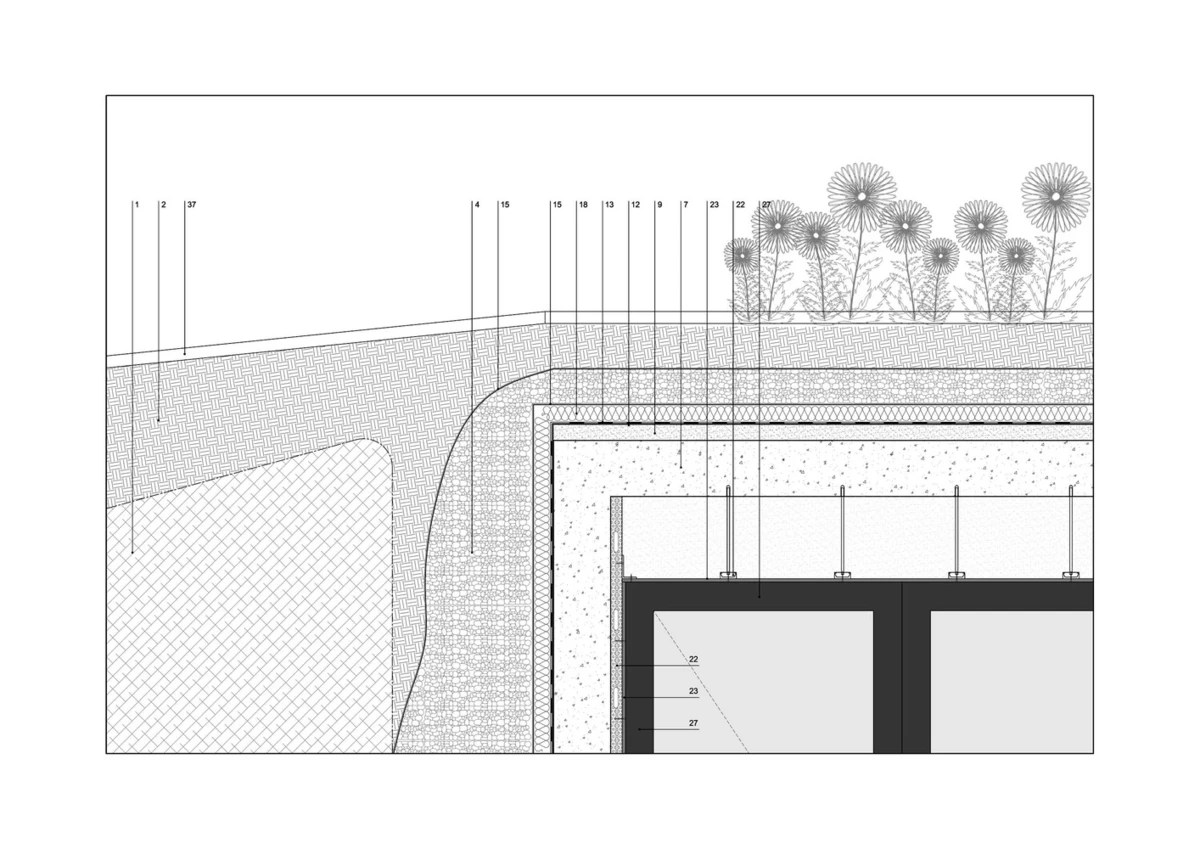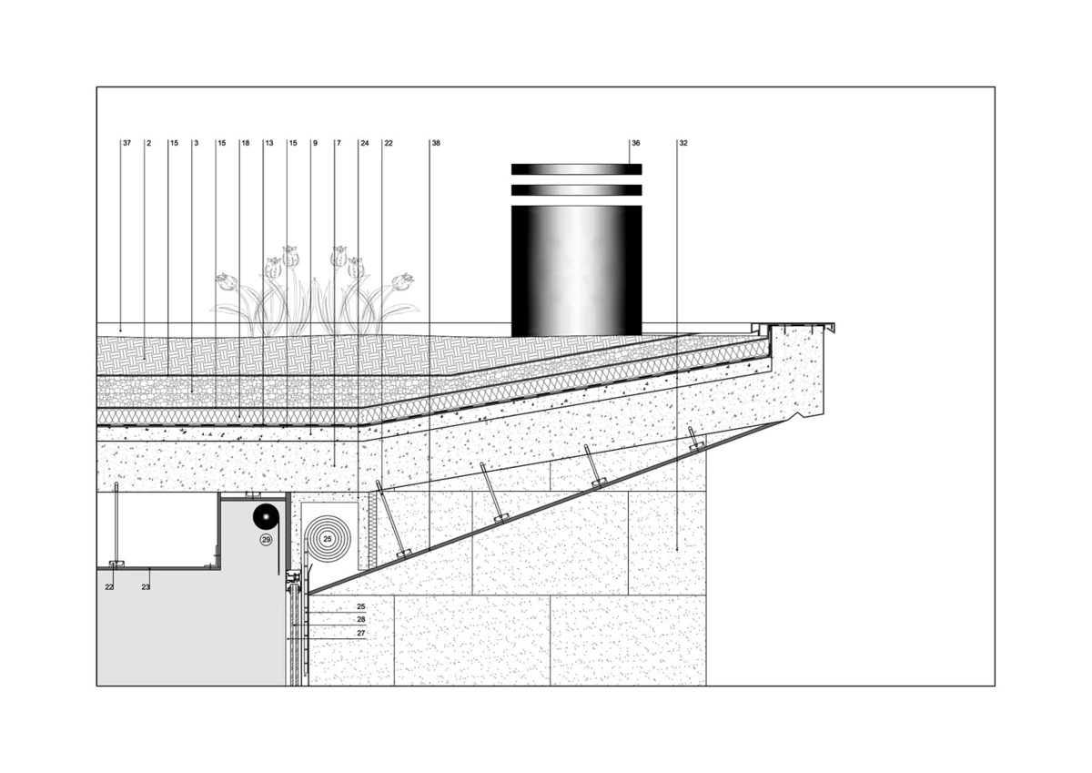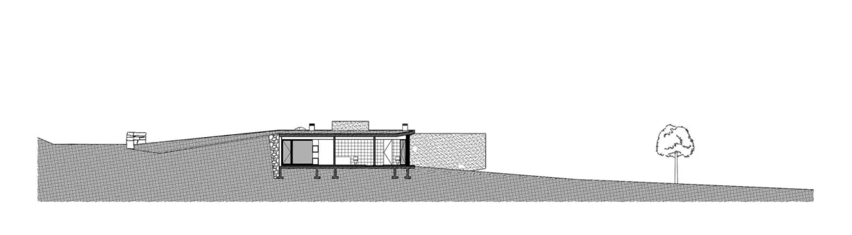 La casa fue concebida para ocultarse de las residencias vecinas y la carretera adyacente, pero sin renunciar a la luminosidad ni a un amplio jardín en su parte trasera. Para lograrlo, los arquitectos la «hundieron» bajo una colina artificial en su extremo oriental, haciéndola emerger en todo su esplendor por el lado oeste. De hecho, toda la fachada este se encuentra enterrada bajo grava y piedra gracias a un ingenioso juego de rampas descendentes para el acceso a pie o en coche de los residentes.