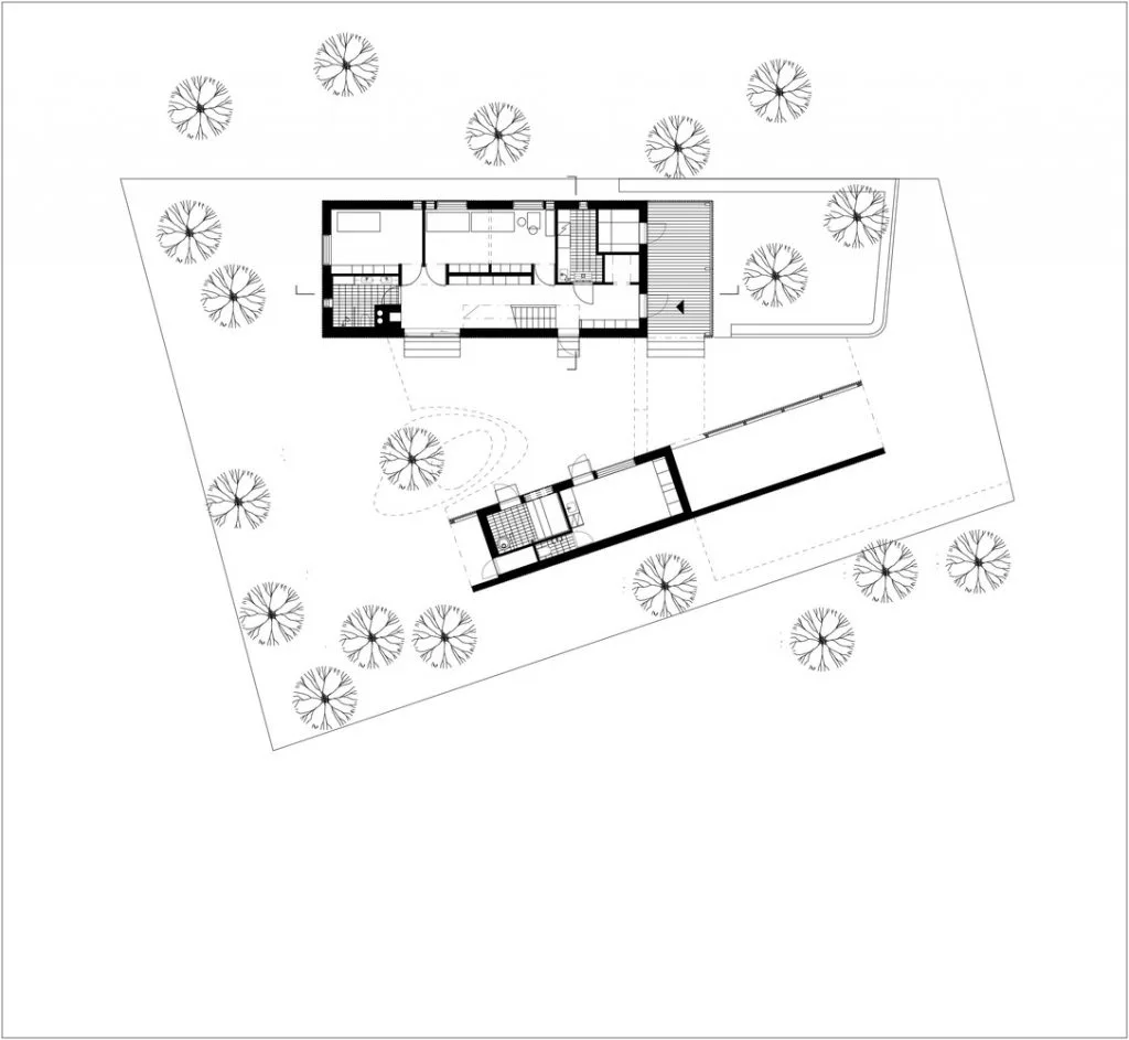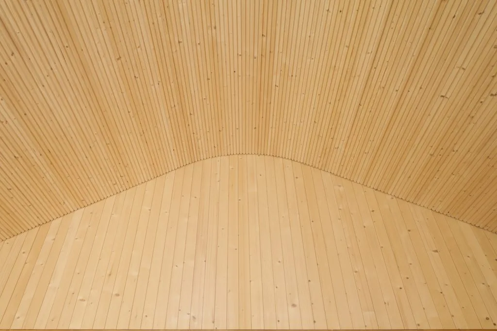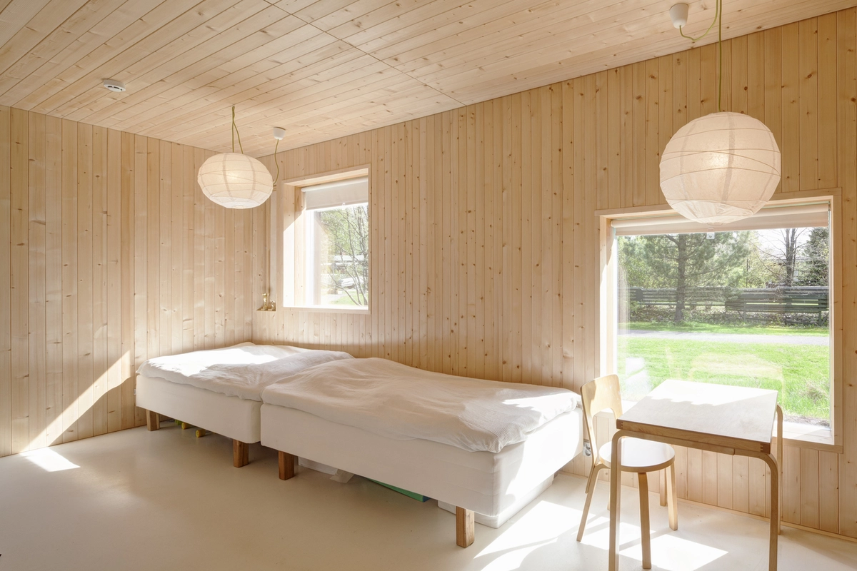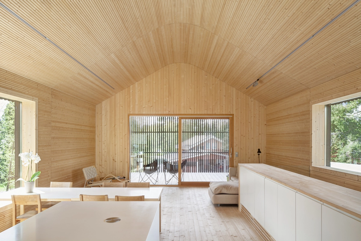 El anexo consta de una habitación de invitados, un taller de trabajo y una sauna -algo imprescindible para un finlandés-, mientras que la vivienda familiar presenta una distribución poco convencional. Los dormitorios y el cuarto de servicio ocupan la planta baja, pasando la sala de estar al primer piso. De este modo se aprovecha al máximo la orientación y el paisaje circundante en esta área común con ayuda de unos grandes ventanales. La forma abovedada del techo contribuye a agrandar visualmente aún más el espacio.