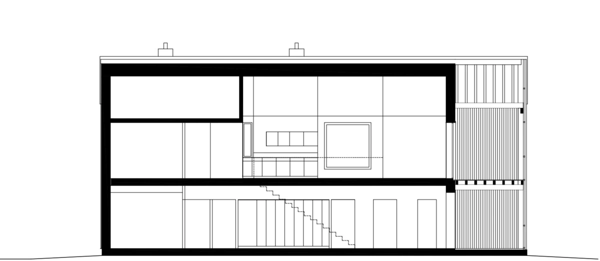 Para poder disfrutar al aire libre de la panorámica del bosque, se incorporó un porche en el extremo más próximo al anexo, que hace las veces de terraza y solárium. Así mismo, el techo de metal, la chimenea y las tuberías de desagüe ponen un contrapunto brillante a la oscuridad de la fachada.
