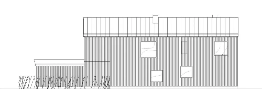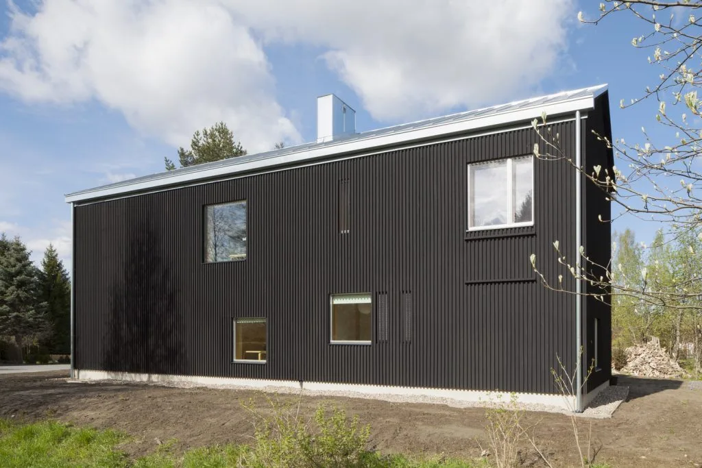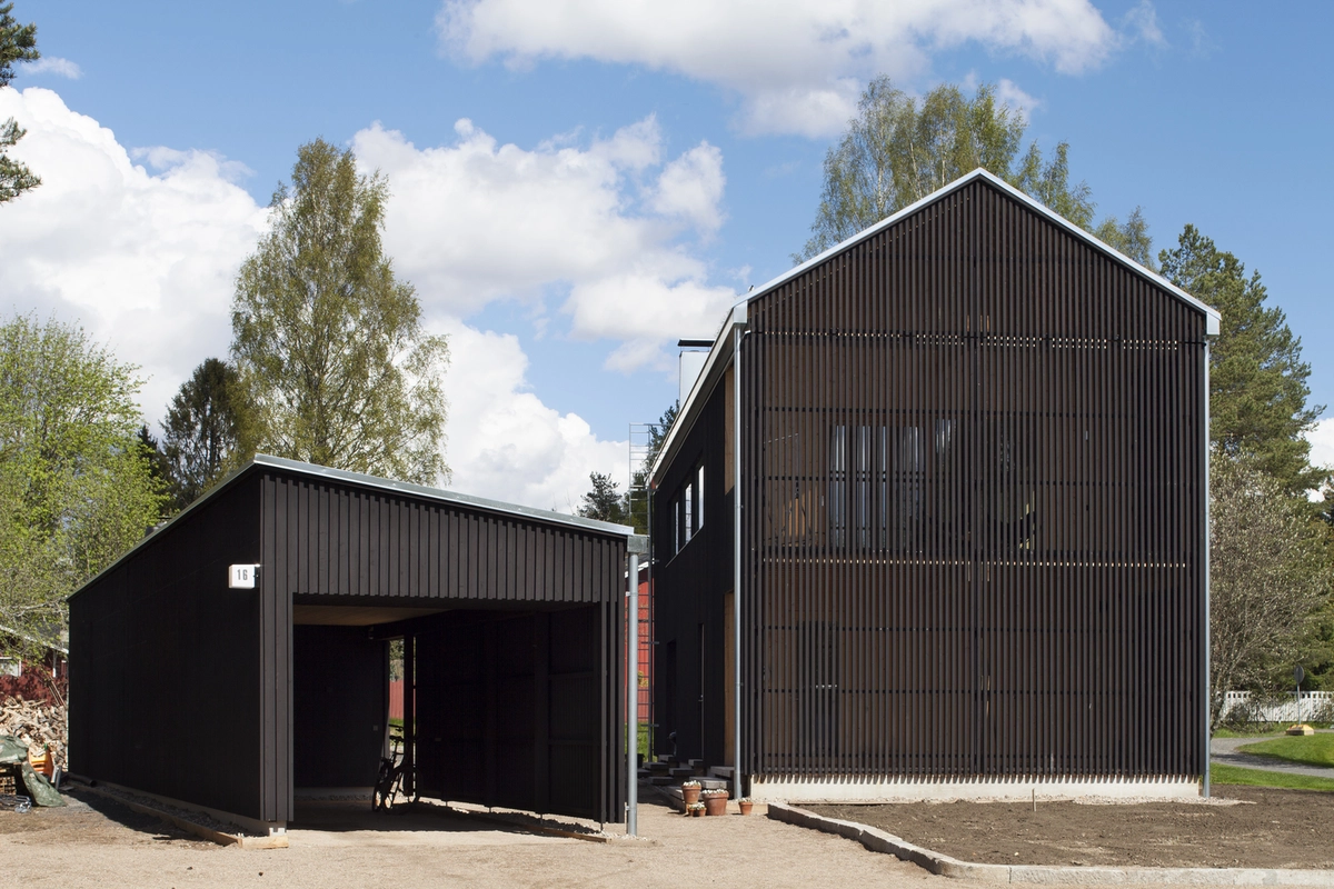 Otro detalle diferenciador de la House H es su apariencia exterior, al estar totalmente cubierta de listones verticales de madera pintados en tono oscuro. Aquí se buscó una protección solar pasiva y un contraste atractivo frente a la claridad nórdica del interior, forrado en madera de abeto sin tratar.