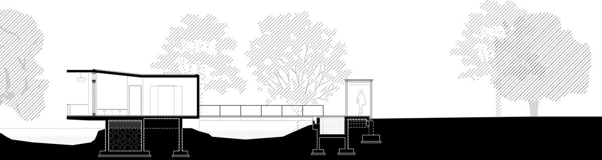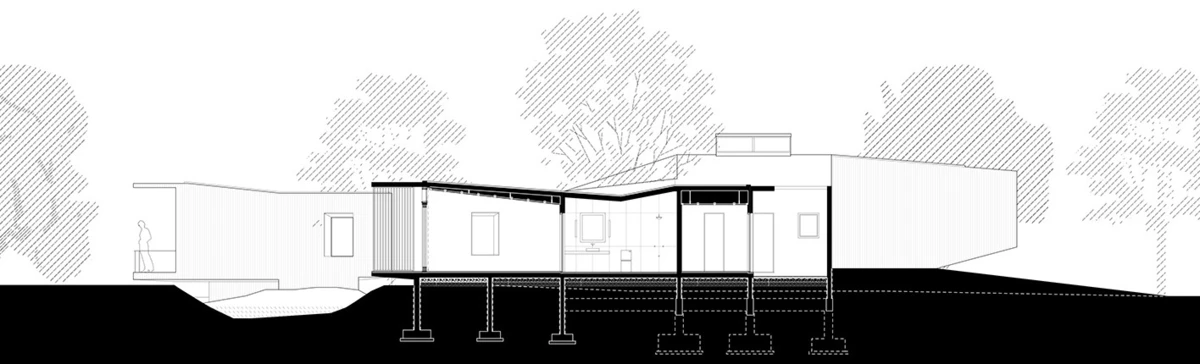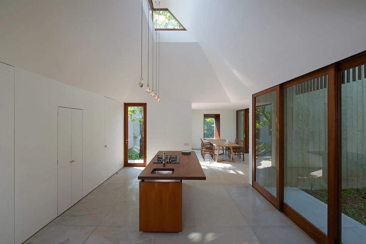 Al ser los propietarios unos entusiastas de la cocina, ésta se convierte en el centro del volumen principal. El techo alto y una claraboya inundan de luz toda el área, mientras que el bloque de hormigón que contiene el salón se eleva sobre el suelo para poder disfrutar plenamente de la vista de los árboles y las montañas. La abundancia de zonas acristaladas de suelo a techo en todas las estancias facilita la inmersión de la naturaleza en el interior, en contraste con los monolitos grises exteriores.