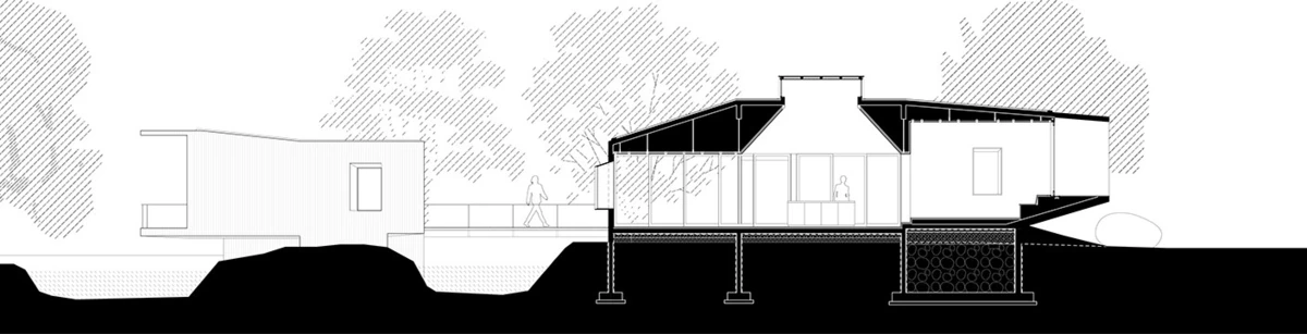 La habitación de invitados también interactúa con el entorno, abrazando un árbol ya existente para crear un patio y un hermoso mirador sobre el agua. Así mismo, la piscina se alinea con la corriente a fin de unirse a ella durante los monzones o bien recordarla durante la estación seca.
