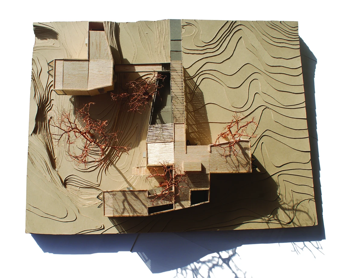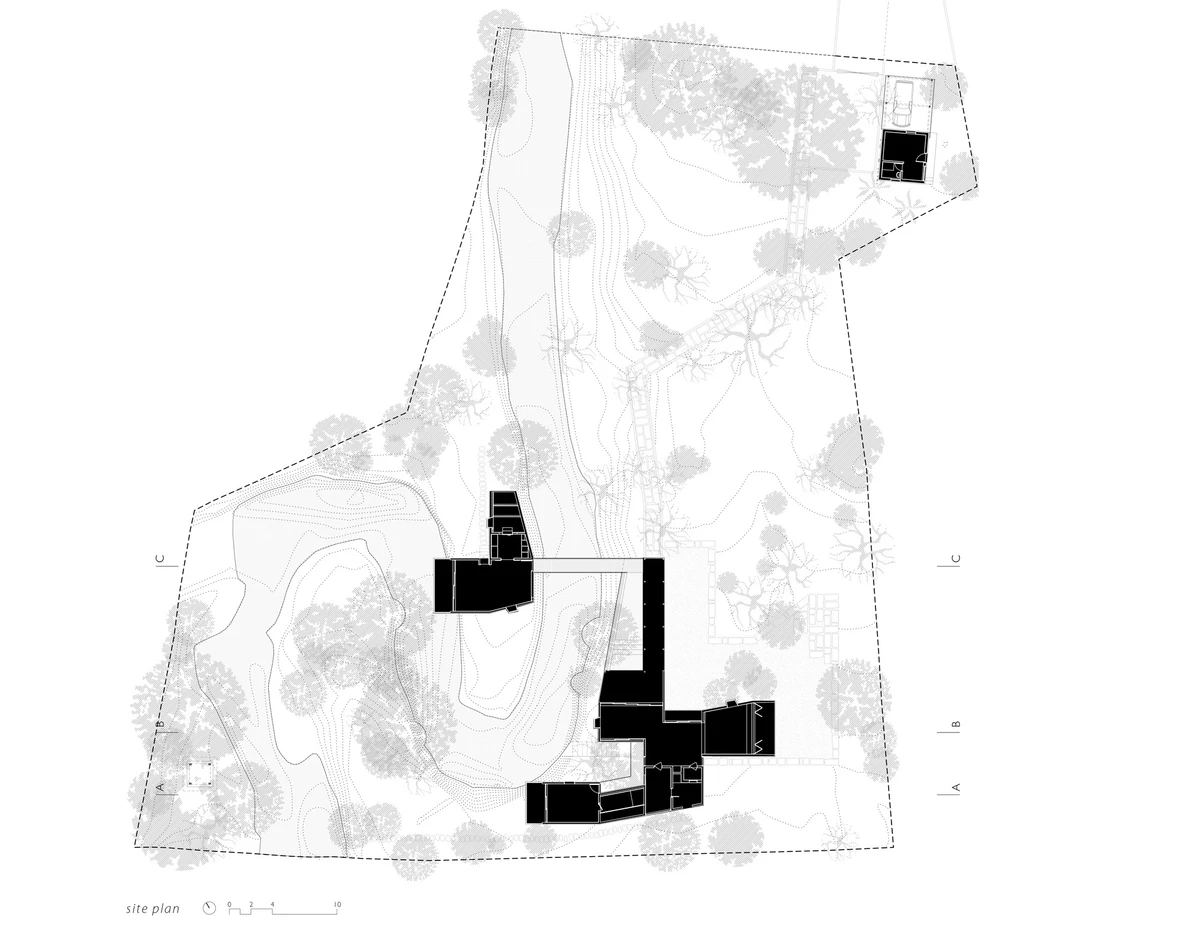 La vivienda aprovecha al máximo todos los elementos del espacio natural donde se asienta. Atravesada por un cauce estacional, se sitúa en ambas orillas de la corriente, sacando partido de un repentino tramo en S del recorrido. Así pues, consta de dos partes bien diferenciadas: las estancias de día, como la cocina-comedor, el salón o la galería de entrada, y la zona del dormitorio principal, a la que se accede por un puente sobre el arroyo.