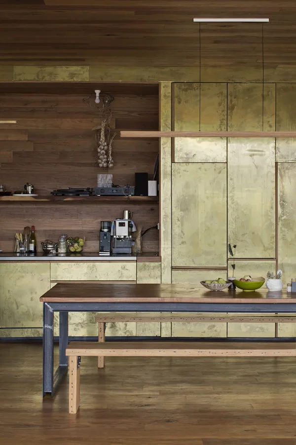 Mientras que uno de los lados de la vivienda rinde homenaje a la extracción del metal, algo que también se refleja en los revestimientos dorados de las paredes, el opuesto honra al aserradero local. En efecto, el lateral que se abre hacia el viejo yacimiento está formado por pantallas móviles de listones de madera sin tratar que se deslizan o se abren, transformando el porche en un espacio totalmente abierto hacia el bosque. Con el paso del tiempo, su tono marrón irá pasando a gris plateado.