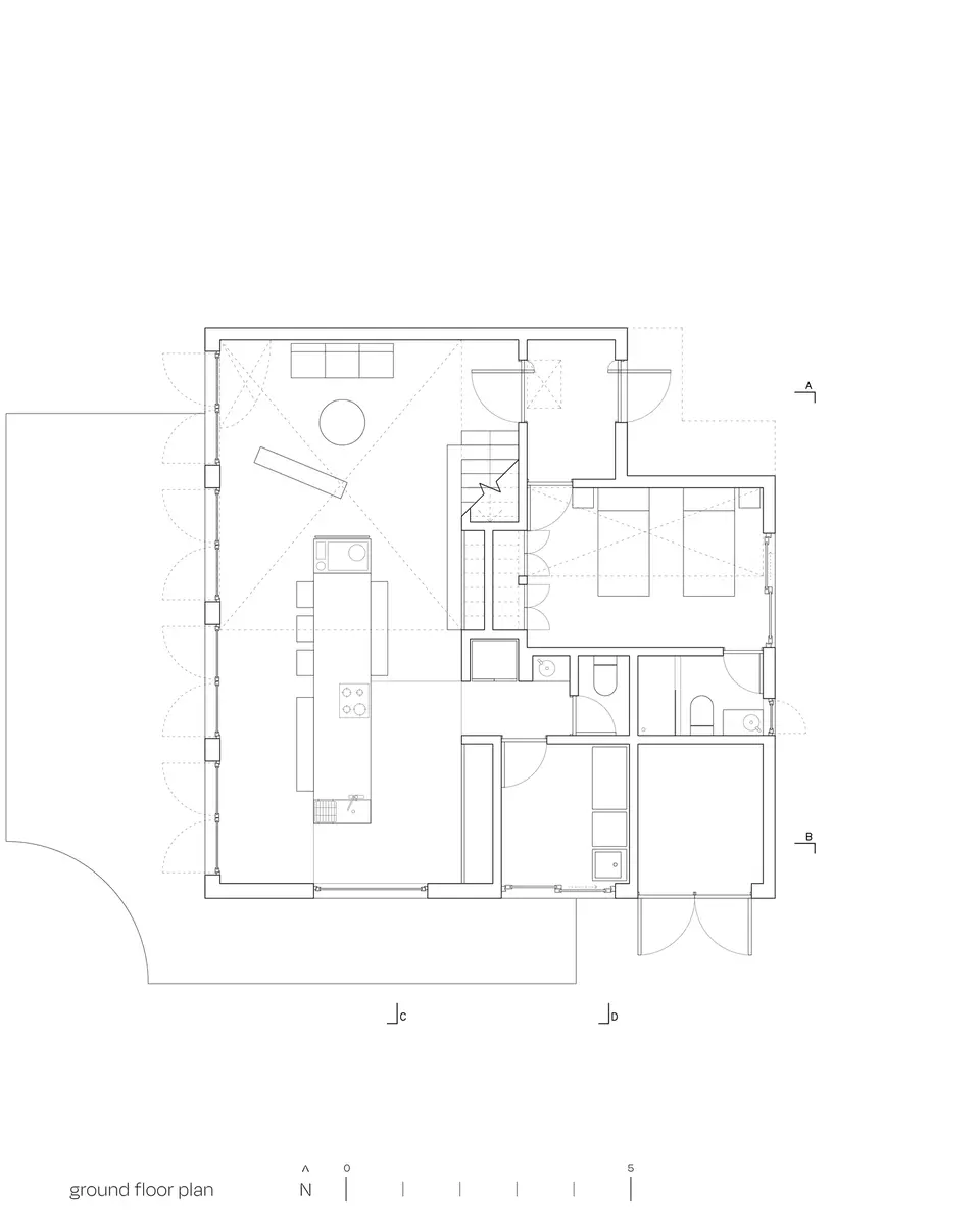 La disposición interior de los espacios se rige también por la dualidad de lo público y lo privado, divididas en ambas mitades de la vivienda. Los espacios públicos se organizan en la zona de mayor altura, creando sensaciones de amplitud y conexión con el exterior. En contraste, las zonas privadas se disponen hacia los espacios de menor altura, sugiriendo una mayor intimidad y recogimiento. La división de estas áreas se basa en conceptos tradicionales de arquitectura, reinterpretándolos en su contexto contemporáneo.