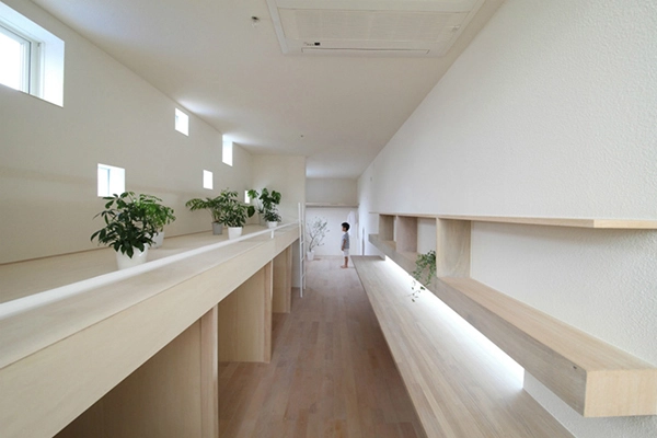 Para encajar el proyecto en una estrechísima parcela -3m de ancho x 21m de largo- las dos plantas de Imai House se extienden a lo largo de los 21 m de parcela. No había sitio para pasillos así que el interior se distribuyó como una secuencia simple de espacios, uno tras otro; se adaptaron las proporciones de cada espacio a las funciones a la que estaba destinado, por ello, el salón tiene una doble altura de 4,4m y el dormitorio infantil sólo alcanza el 1,3m de altura; del mismo modo, la luz de cada espacio se adaptó en función del número de personas destinadas a disfrutarla: la habitación individual tiene luz natural limitada frente al espacio común que disfruta de mucha más luminosidad. Equilibrar la escala y la luz confiere personalidad a un simple espacio.