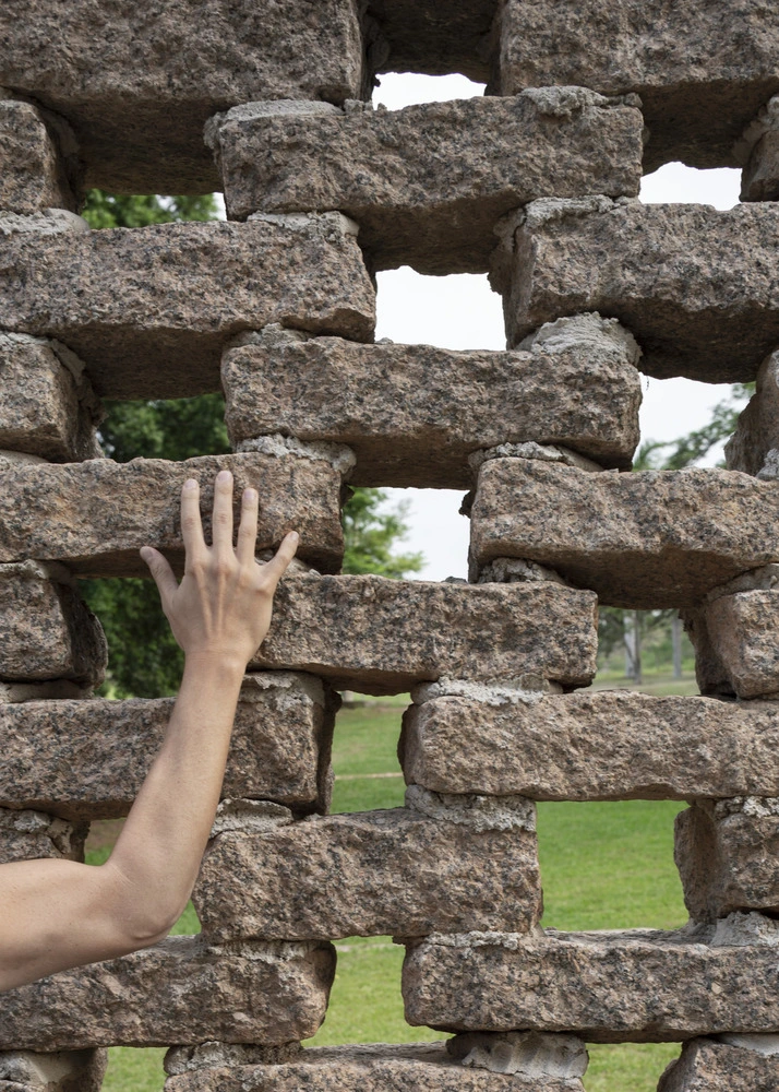 Se aprovechó la cimentación preexistente, disponiendo dos muros paralelos en su perímetro y un tercero de mayor longitud y perpendicular a los anteriores. Los tres se construyeron con pequeños bloques de piedra recuperados de un viejo camino de acceso a la hacienda. Lejos de compartimentar el espacio, el proyecto prevé amplias zonas de libre paso que comunican de manera diáfana cada corredor en los puntos de cruce.