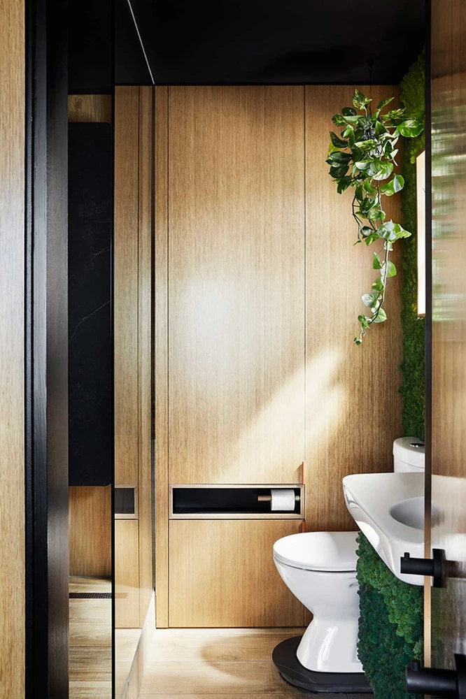 Desde el dormitorio (con mesilla abatible, por supuesto) se accede a este baño, que es un auténtico jardín. Chen incorporó allí una pared de musgo y varias plantas para crear la sensación de estar en el exterior.
