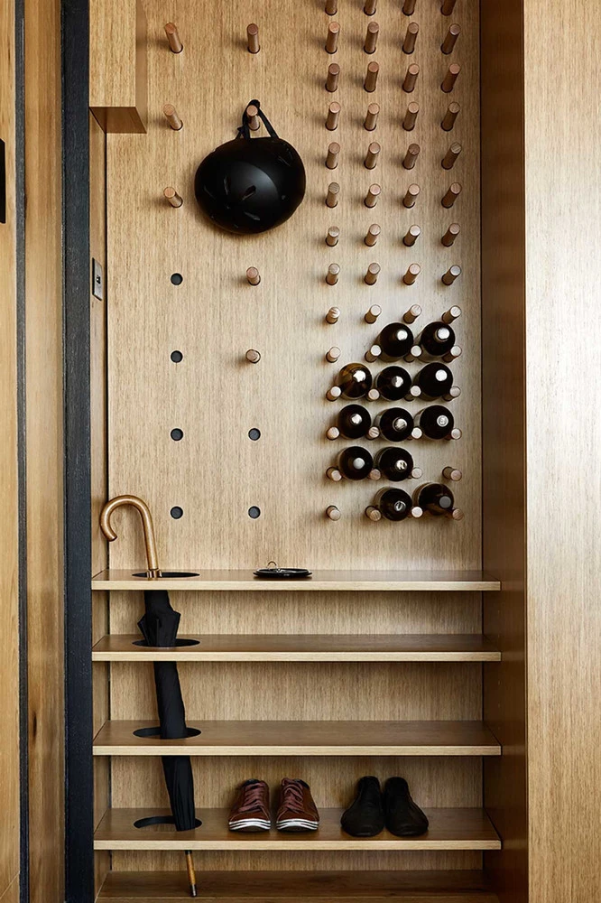 Otros elementos, como espejos, luces LED empotradas, mobiliario plegable o un recibidor donde guardar zapatos, colgar abrigos o almacenar botellas de vino contribuyen también al minimalismo eficaz de un apartamento estudiado hasta el último detalle.