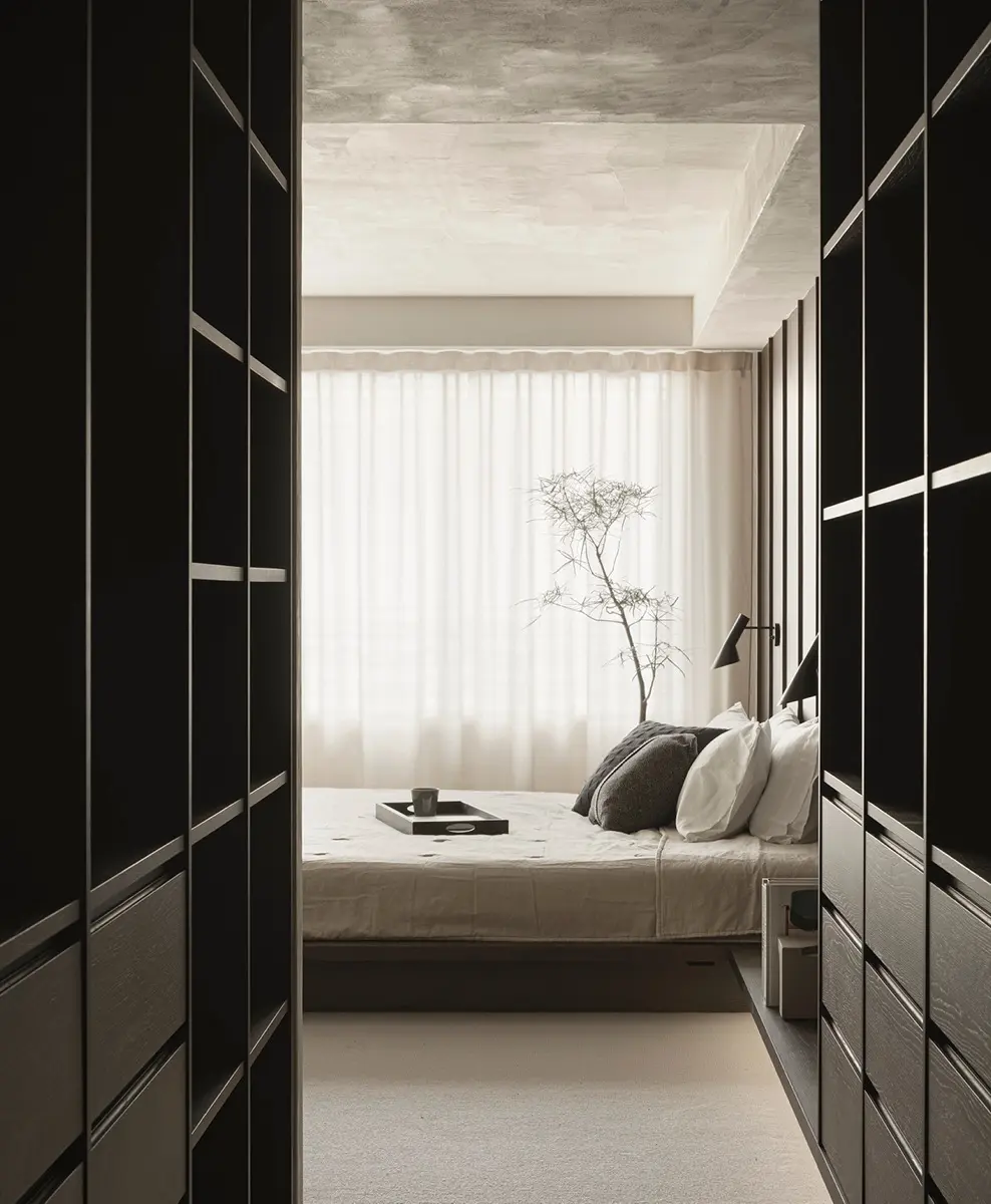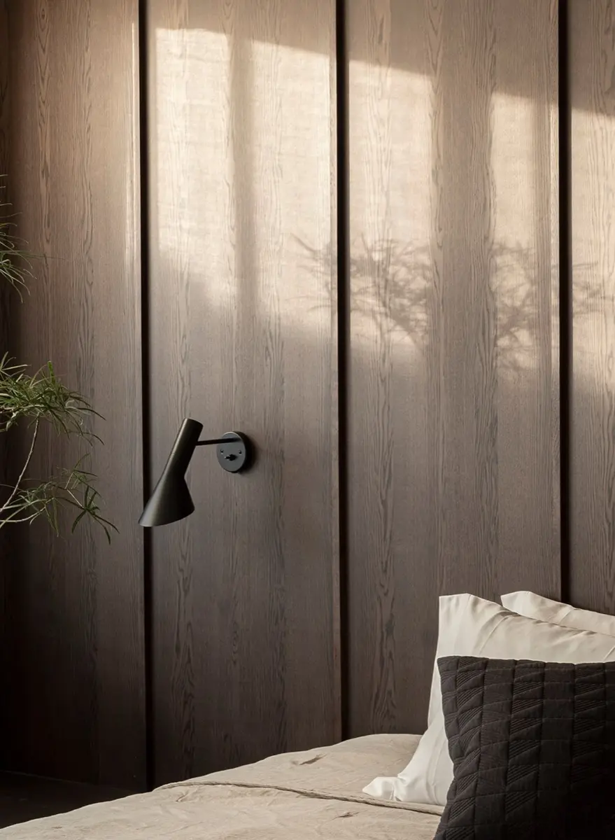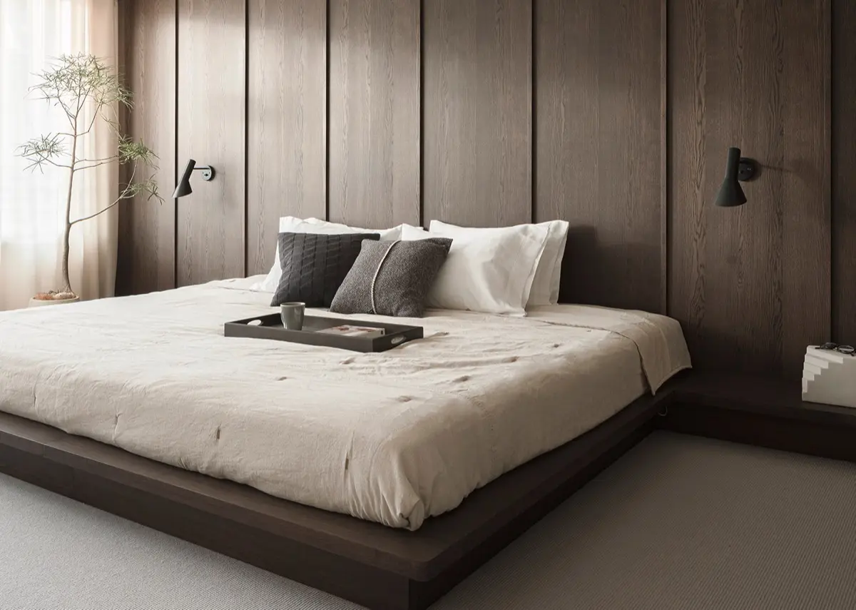 Paneles oscuros hechos de roble ahumado revisten las paredes del dormitorio principal, que también cuenta con gabinetes de almacenamiento abiertos hechos de la misma madera. La cama se asienta sobre un zócalo de madera que se extiende desde la pared y también funciona como un estante bajo.
