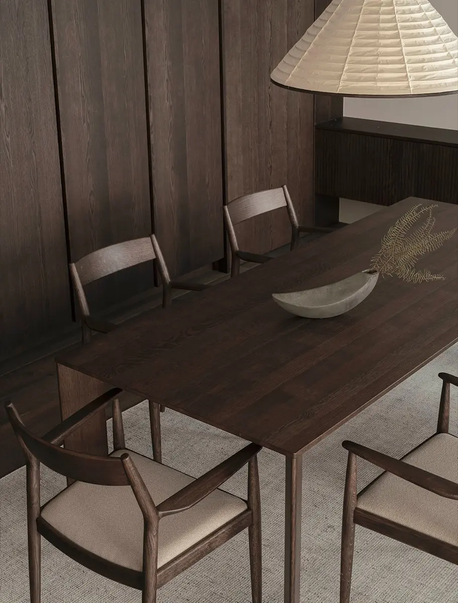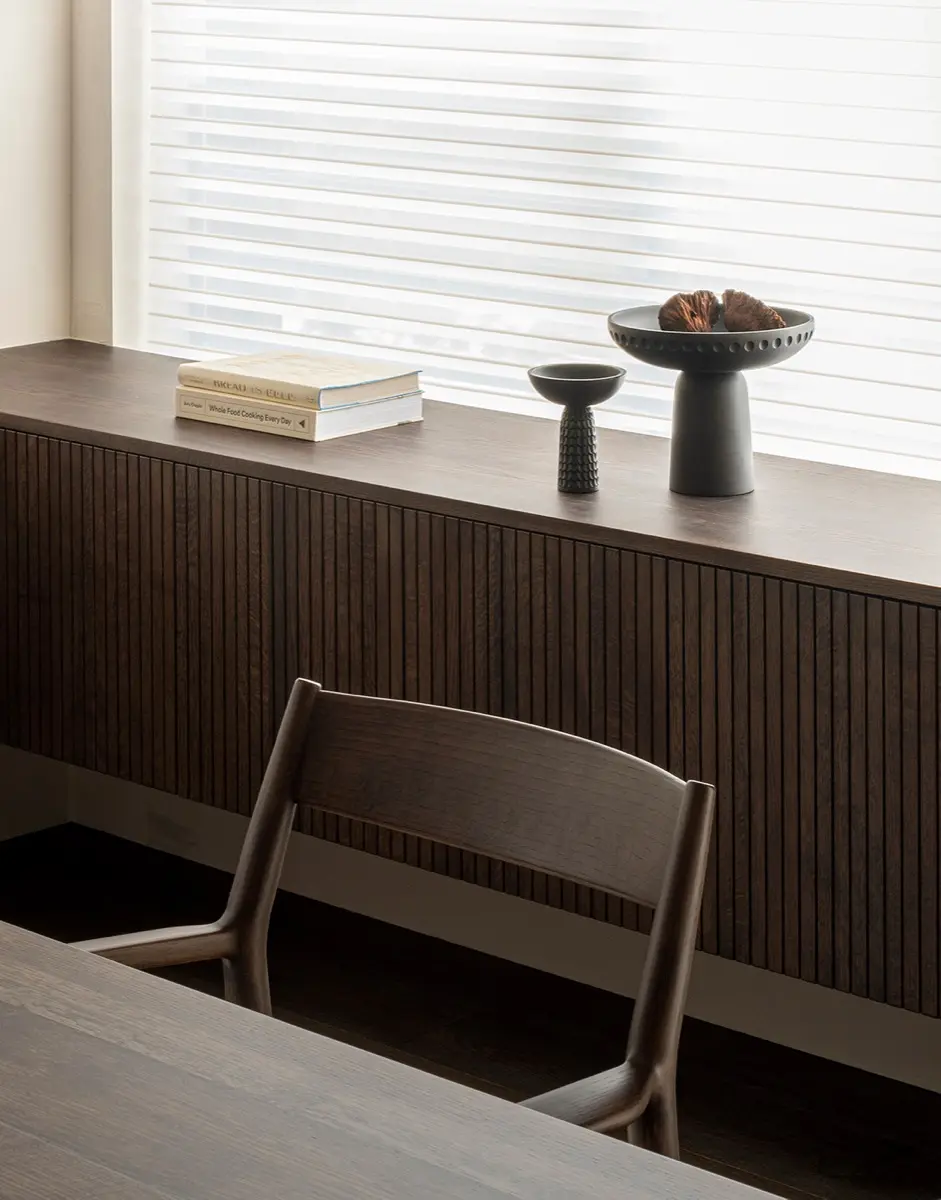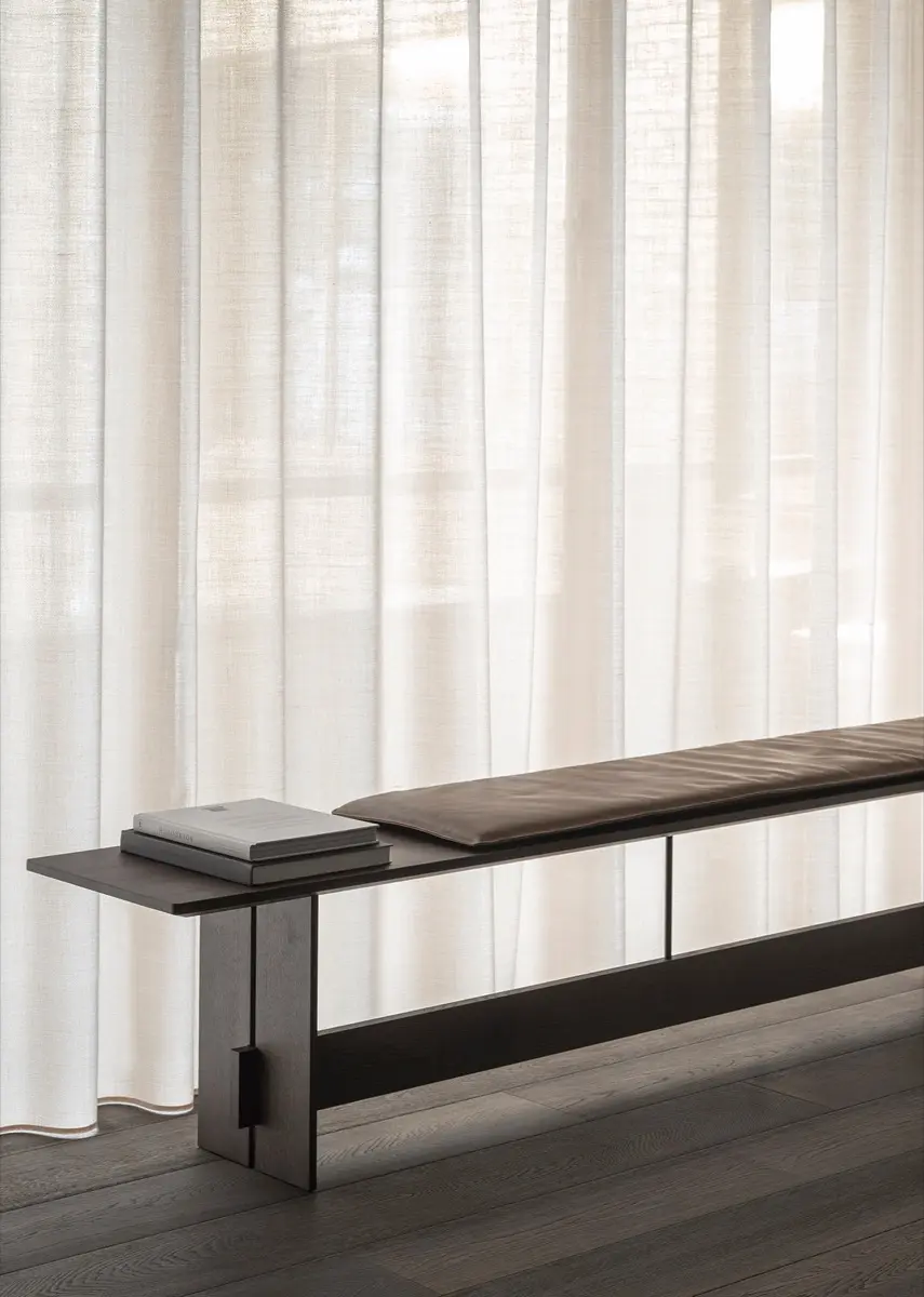 Esa influencia se puede apreciar en el insistente empleo de madera natural en tonos oscuros, para tarimas en suelo, revestimientos de pared y panelados de mobiliario, que combinan a la perfección con alfombras exuberantes y tapicerías en tonos neutros y con mucha textura. Se genera así una sensación acogedora, silenciosa, una atmósfera de cueva, contemplativa, que los diseñadores han extendido por toda la casa.