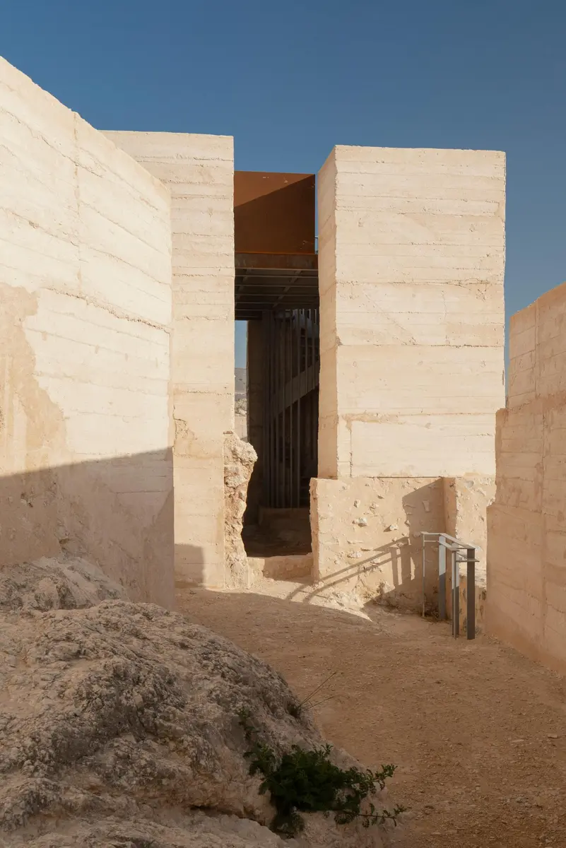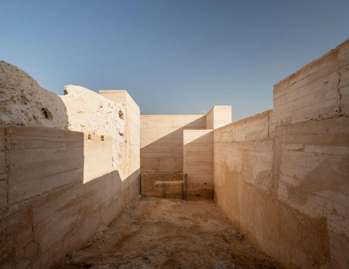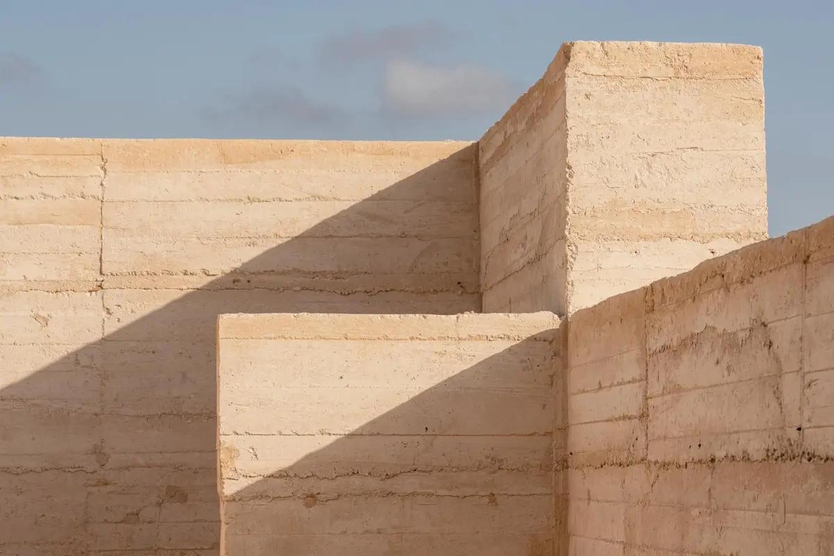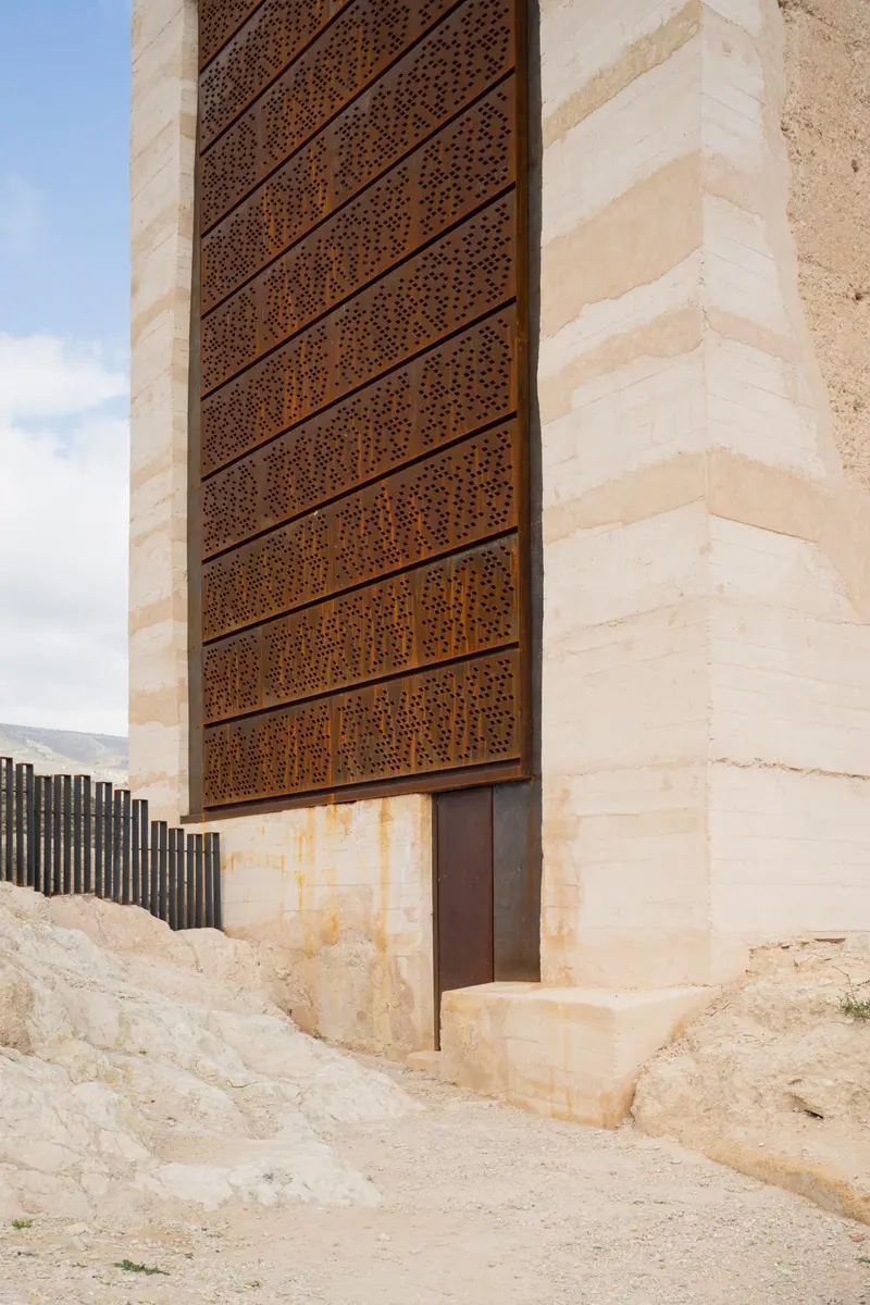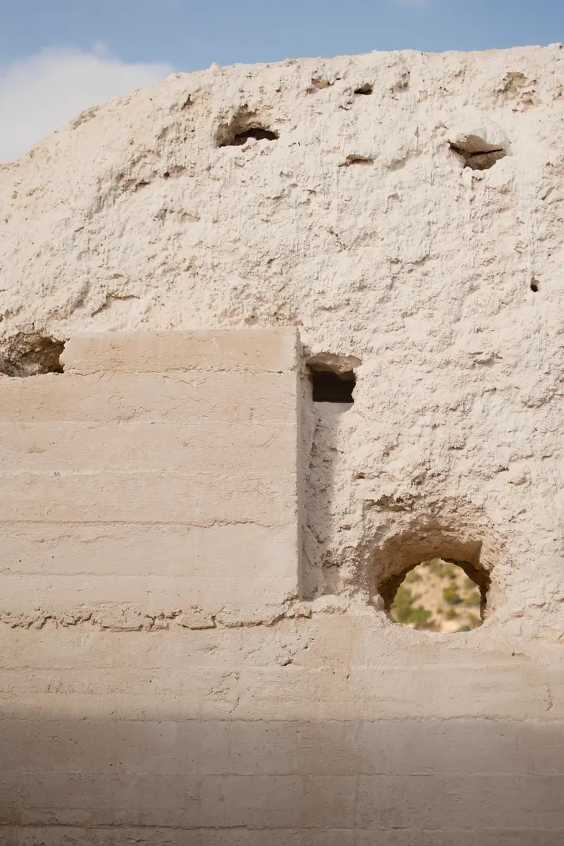 Una paleta de materiales sencilla y eficaz se utiliza para la intervención. Por un lado, los trabajos de masificación del fuerte y consolidación de sus muros se ejecutan mediante muros de argamasa de caliza y arena, que consiguen una materialidad moderna y escultórica (gracias al despiece de sus encofrados) y a la vez dialogante con lo existente y los colores del terreno.