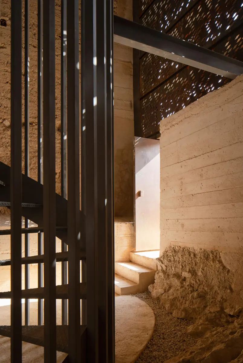 Por otro lado, el empleo de estructura metálica vista para las nuevas intervenciones; planchas de acero cortén en las embocaduras de los huecos de paso que horadan los muros y para la nueva fachada perforada, y una escalera circular que da acceso a la cubierta , ahora transitable, de la Torre del Homenaje.