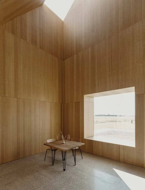 Así pues, aunque el edificio rompe de manera abrupta la horizontalidad de los campos de trigo, su vocación es ser un escaparate permanente de los mismos. Una orientación hacia el exterior a base de paredes acristaladas enmarca las vistas del paisaje y llena de luz natural un interior diáfano. Para evitar las columnas, toda la estructura se sustenta gracias a un espectacular entramado de vigas de madera. Esto proporciona una flexibilidad absoluta a la hora de distribuir cada una de las actividades educativas del centro.