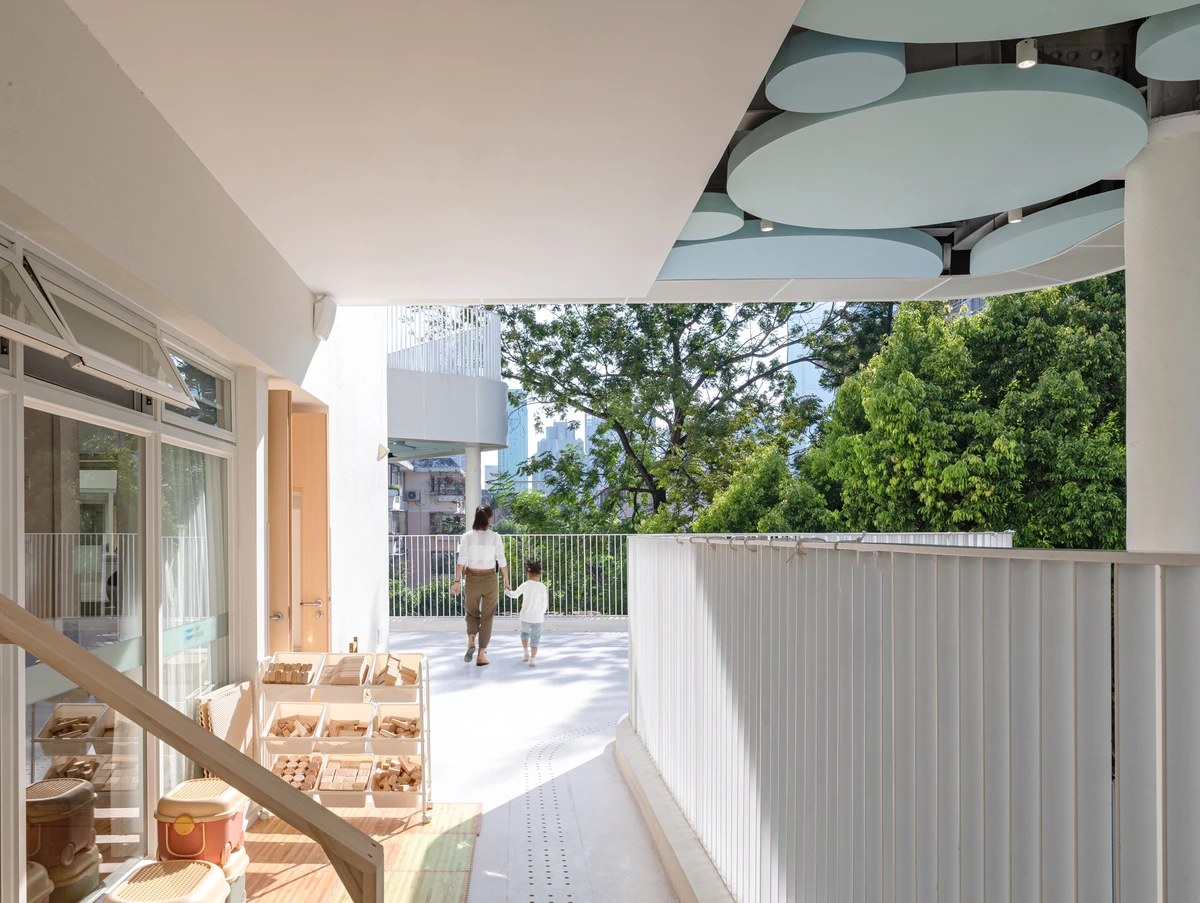 Las aulas, distribuidas en volúmenes que se proyectan hacia el exterior, no son solo espacios de aprendizaje, sino también de descubrimiento. Cada sala, con conexión directa a terrazas y espacios abiertos, invita a los niños a explorar más allá de las paredes físicas y mentales. Estas áreas, bañadas en luz natural y colores suaves, son el escenario perfecto para que los pequeños interactúen con su entorno de manera intuitiva y espontánea.