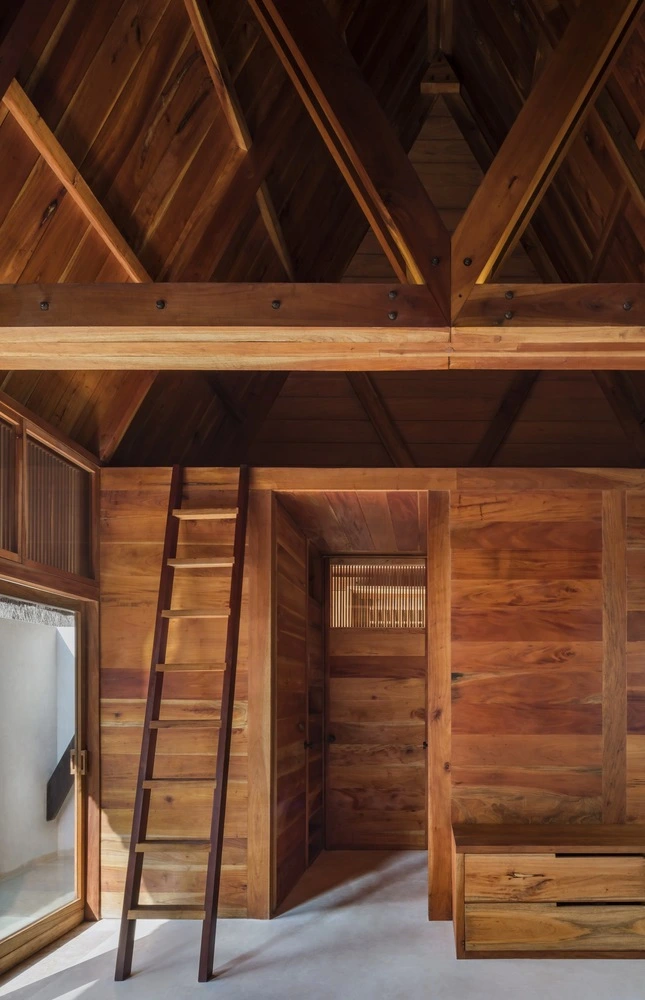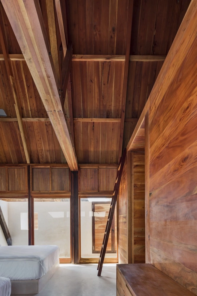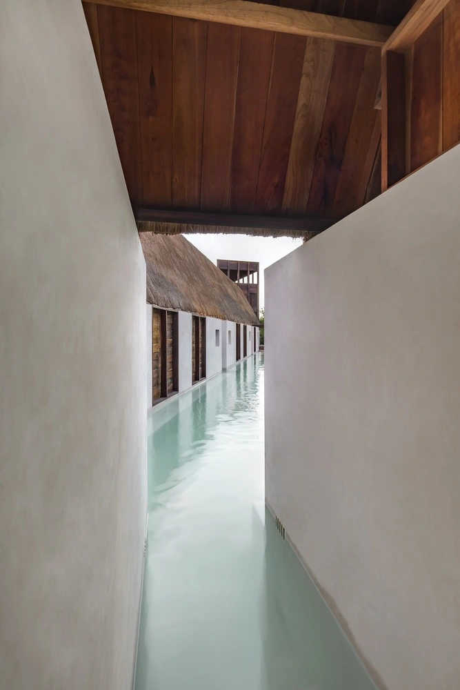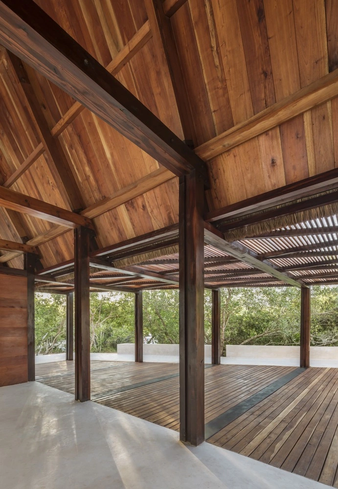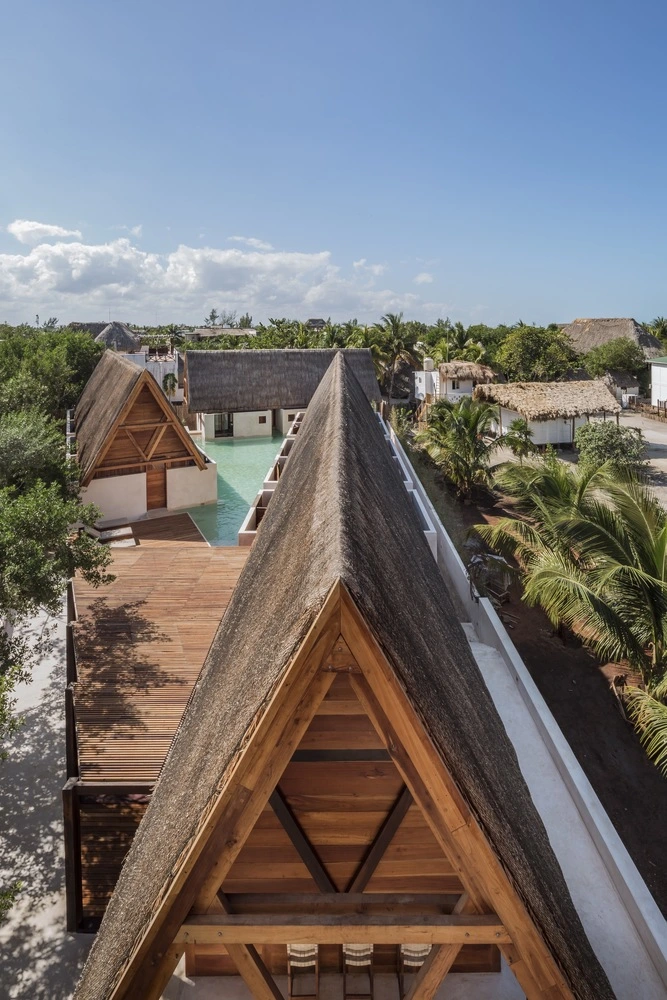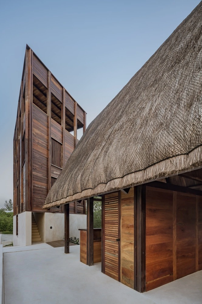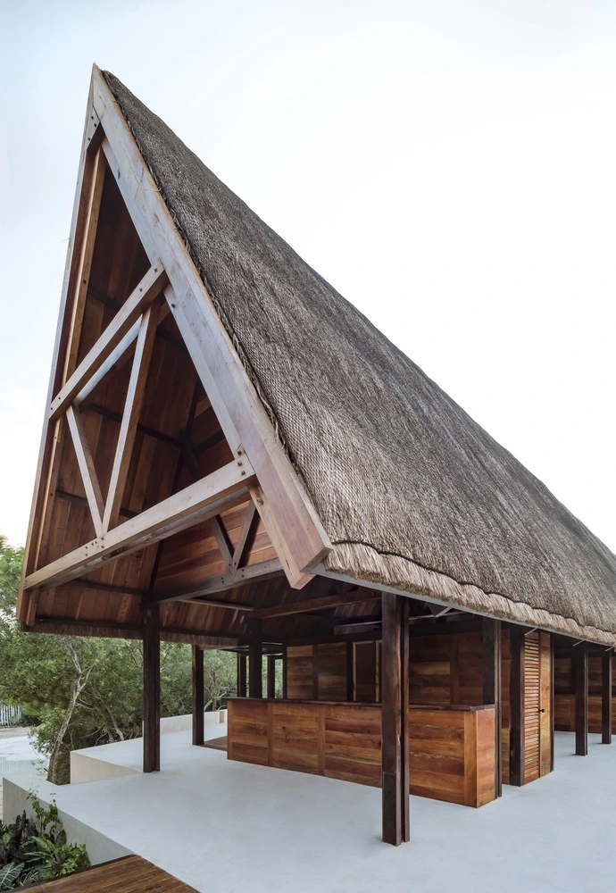 Para conformarlo, el programa se dividió en tres volúmenes alargados de una sola altura que albergan las habitaciones. Sin llegar a tocarse, cada una de estas estructuras se inspira en las palapas mayas, elevadas sobre el suelo para salvar el aumento del nivel del mar. Con un sólido armazón de madera de cedro rojo y cubierta a dos aguas, las tres cabañas incorporan un recubrimiento tradicional, el chukum –elaborado a partir de resina de un árbol nativo de México y polvo de piedra caliza–, que aporta impermeabilidad y un color terroso natural. Los tejados a base de hojas de palma terminan de perfilar el espíritu caribeño del hotel.