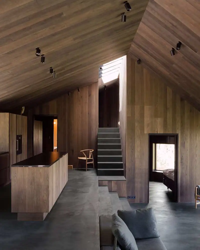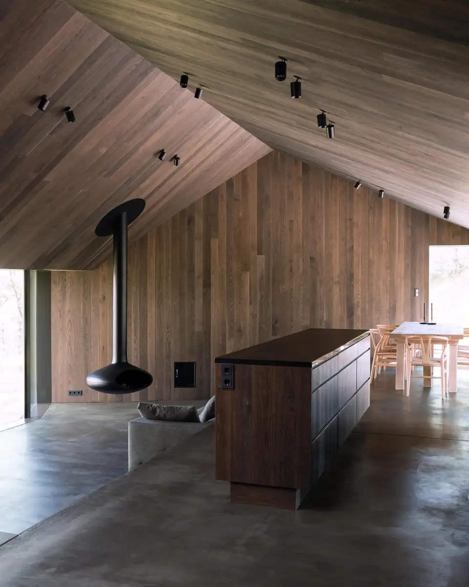 El interior minimalista conjunta los suelos de hormigón en gris y el roble oscurecido con sulfato de hierro, una mezcla elegante potenciada por la iluminación del tragaluz, los ventanales y una llamativa chimenea suspendida.