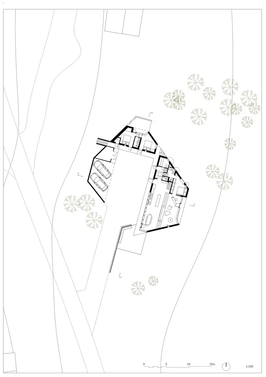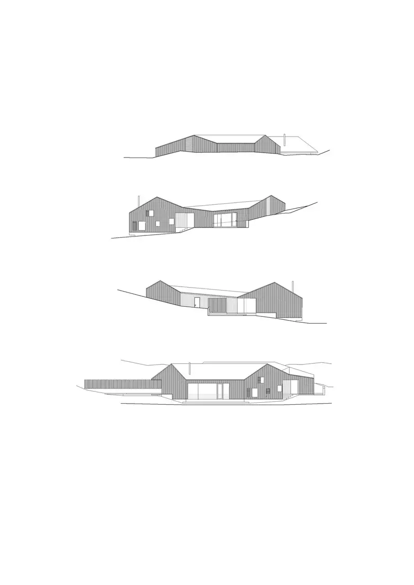Lo primero que destaca es su particular geometría, perfectamente adaptada a la topografía de la parcela. Al estar situada a 982 metros sobre el nivel del mar, dispone de unas hermosas vistas sobre el valle, pero hay que tener en cuenta que en los meses más fríos las nevadas son muy abundantes, por lo que solo es accesible mediante motos de nieve o esquís.