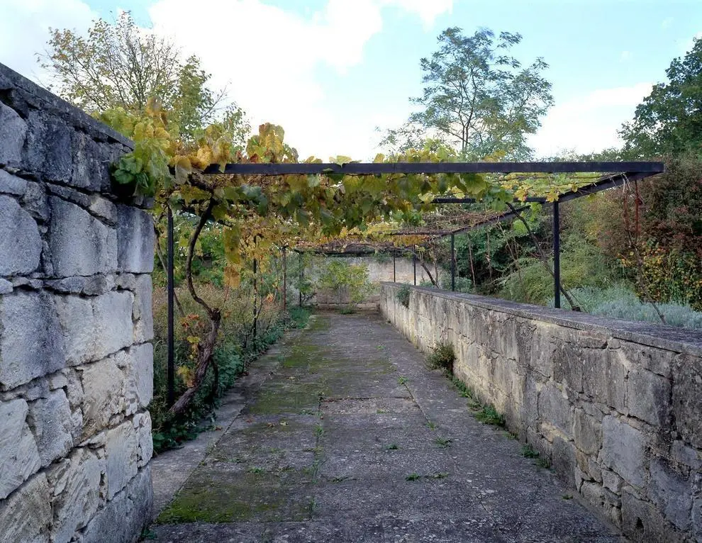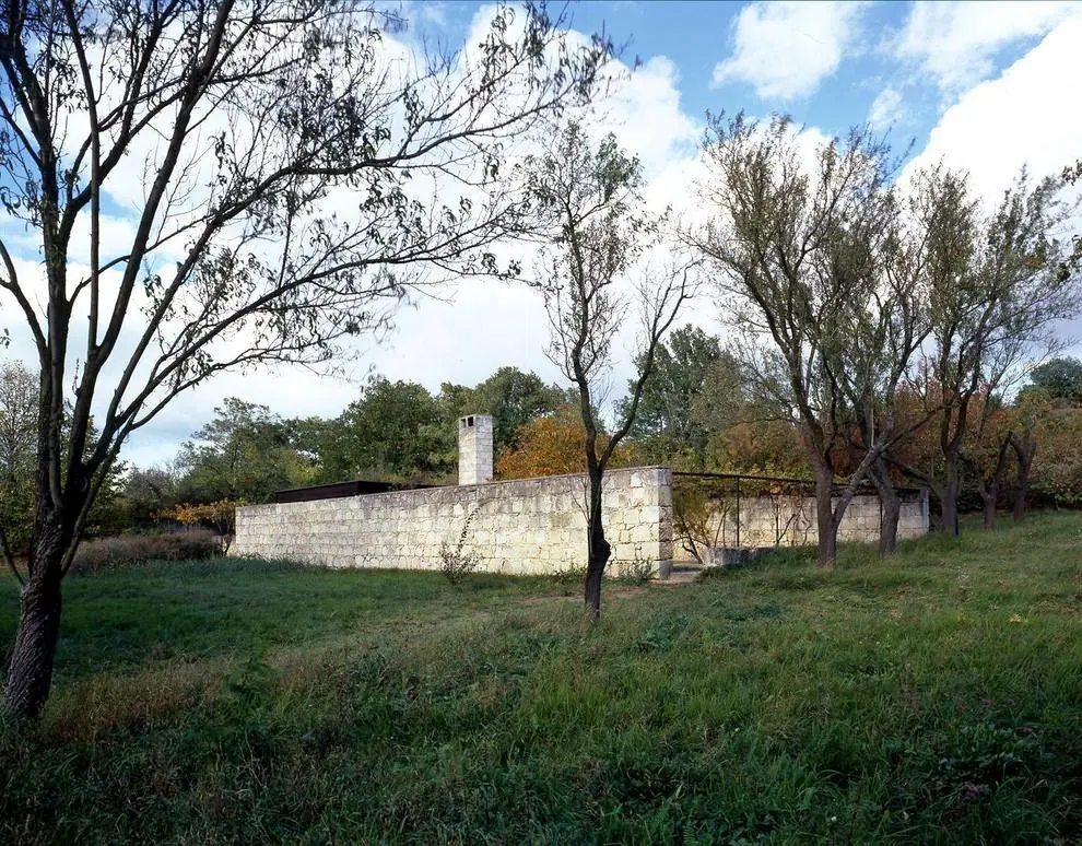 Lo primero que llama la atención es la extensa pérgola de hierro situada al norte y el gran muro sin ventanas del lado oeste. Para su construcción, Rainer empleó bloques tallados a mano de piedra caliza extraída de una cantera cercana, explotada ya en época romana. Las paredes resultantes constituyen un homenaje a los campesinos de la zona, que utilizaban este mismo material para levantar las tapias de protección de sus viñas. Un espléndido trabajo de mampostería prolongado en la esbelta chimenea que corona la casa.