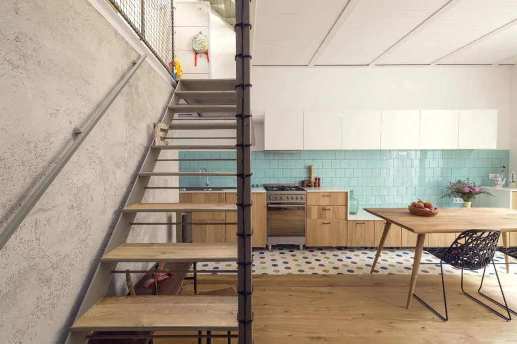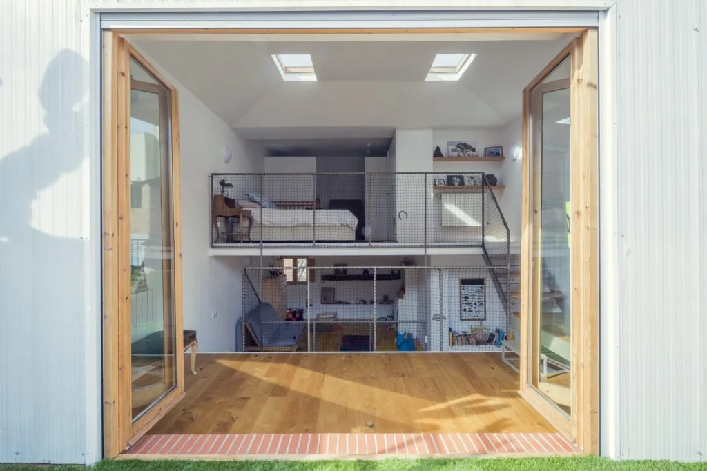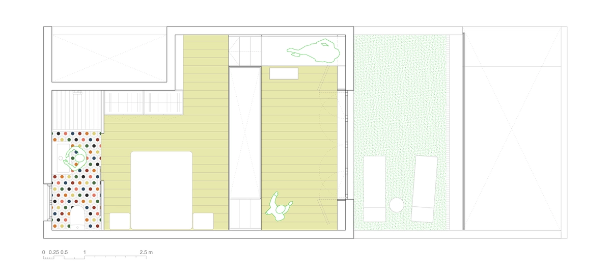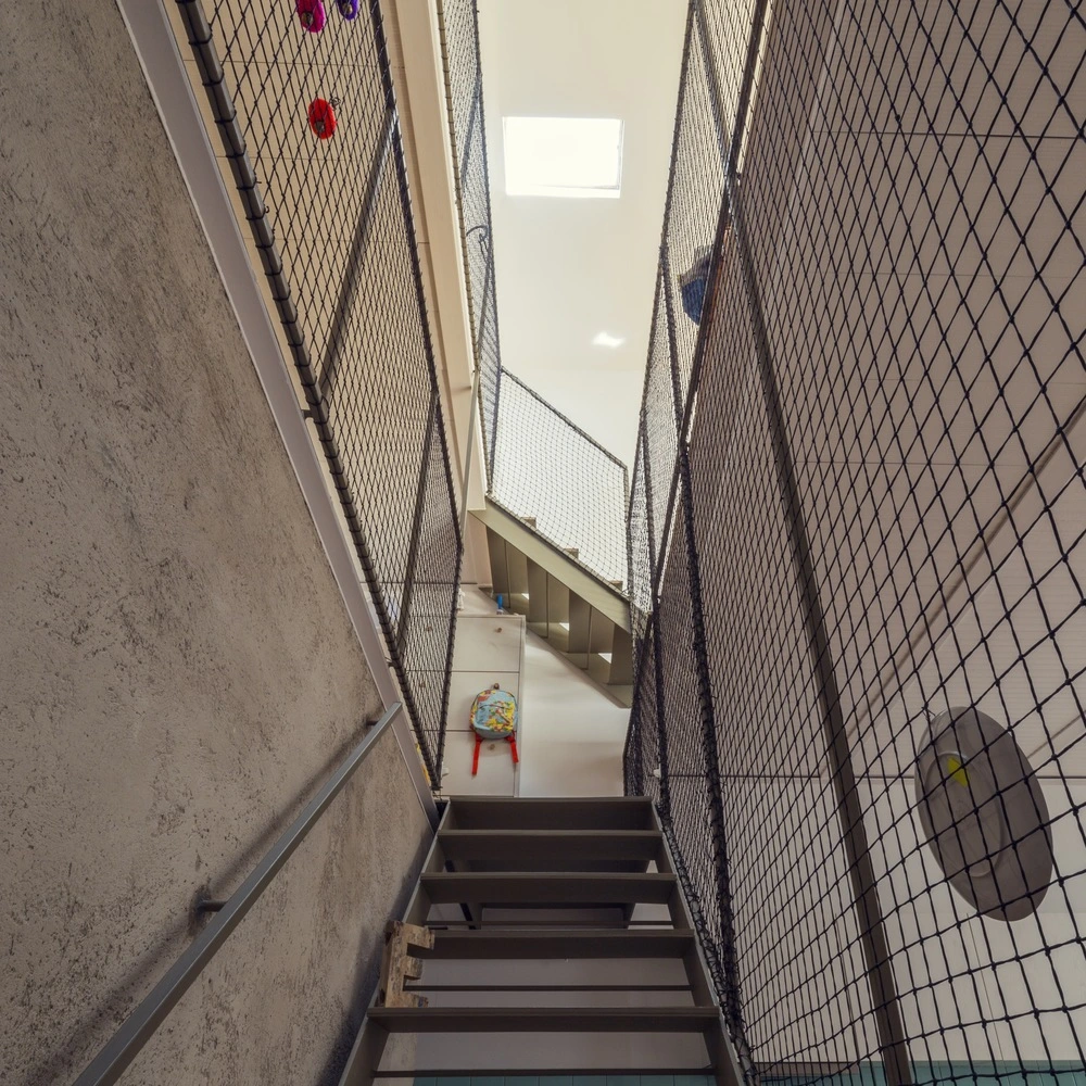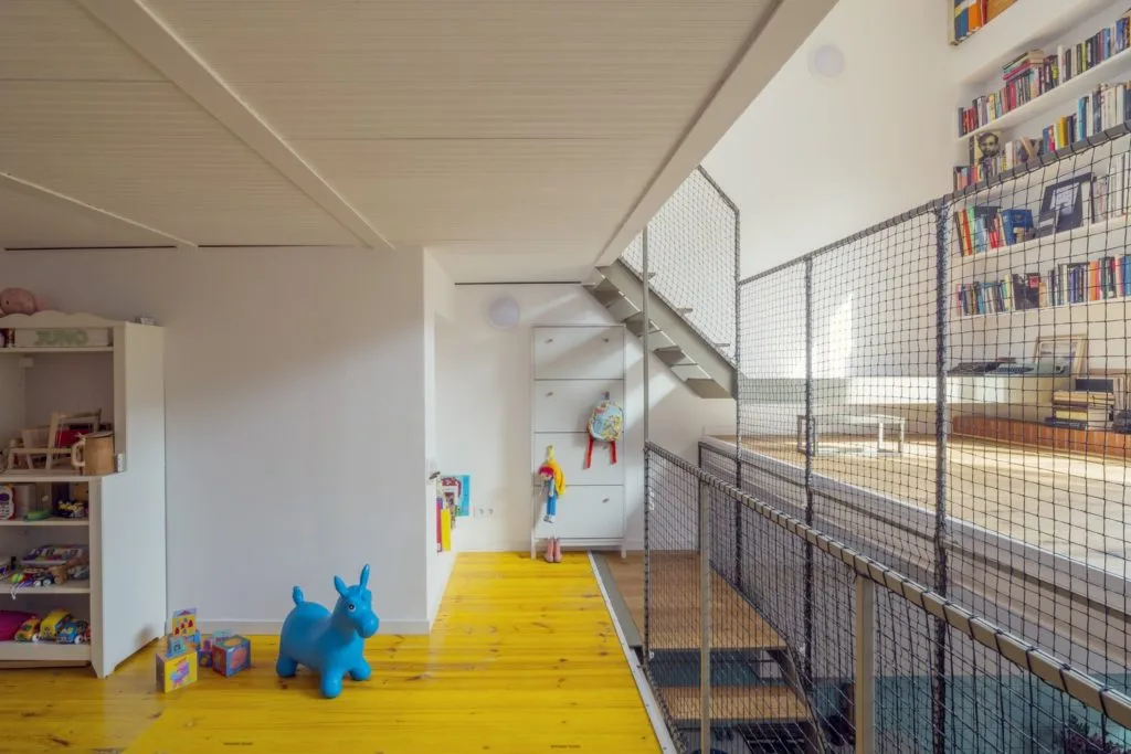 Así pues, la estructura original dio un vuelco drástico. Una escalera colocada de forma transversal vertebra ahora los diferentes niveles, que pasan a ser tres al desalinear los forjados originales en las zonas dedicadas a dormitorio, dejando a medio camino el de la pequeña Juno. Esto facilita la supervisión de las madres tanto desde la habitación principal como desde el estudio.
