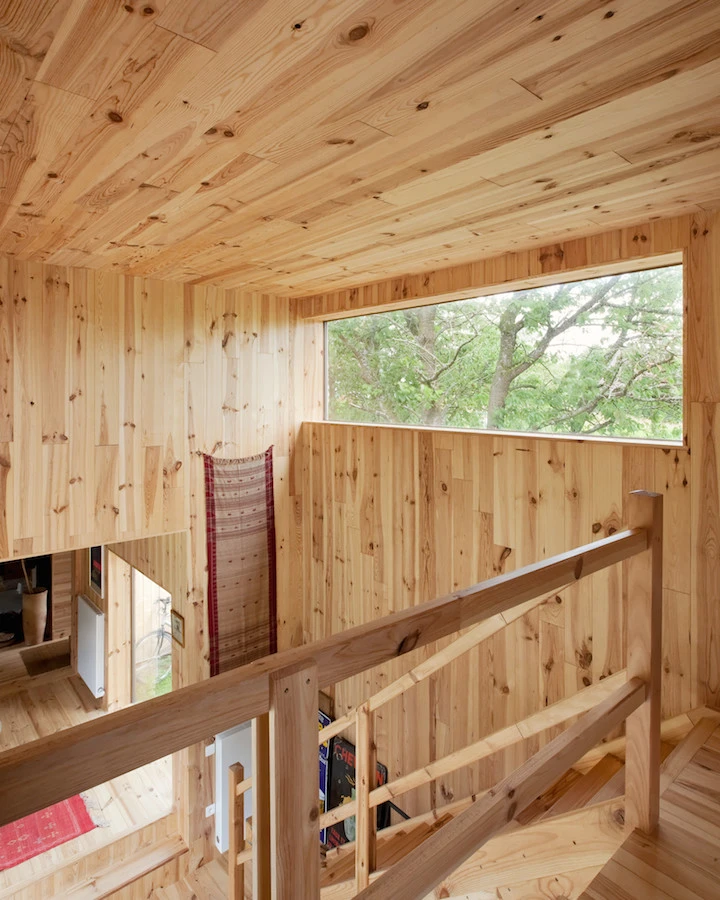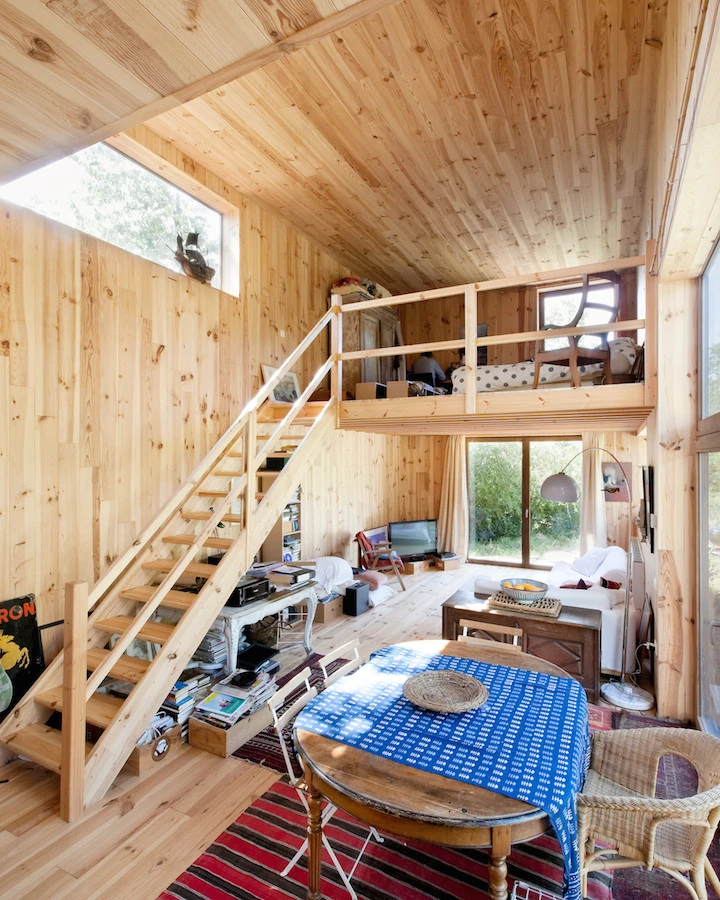 Opta por el uso de la madera como material de construcción en sus 110 m2 lo que ha permitido construir esta casa de una manera fácil y rápida además de permitir su adaptación a un terreno irregular y en pendiente.