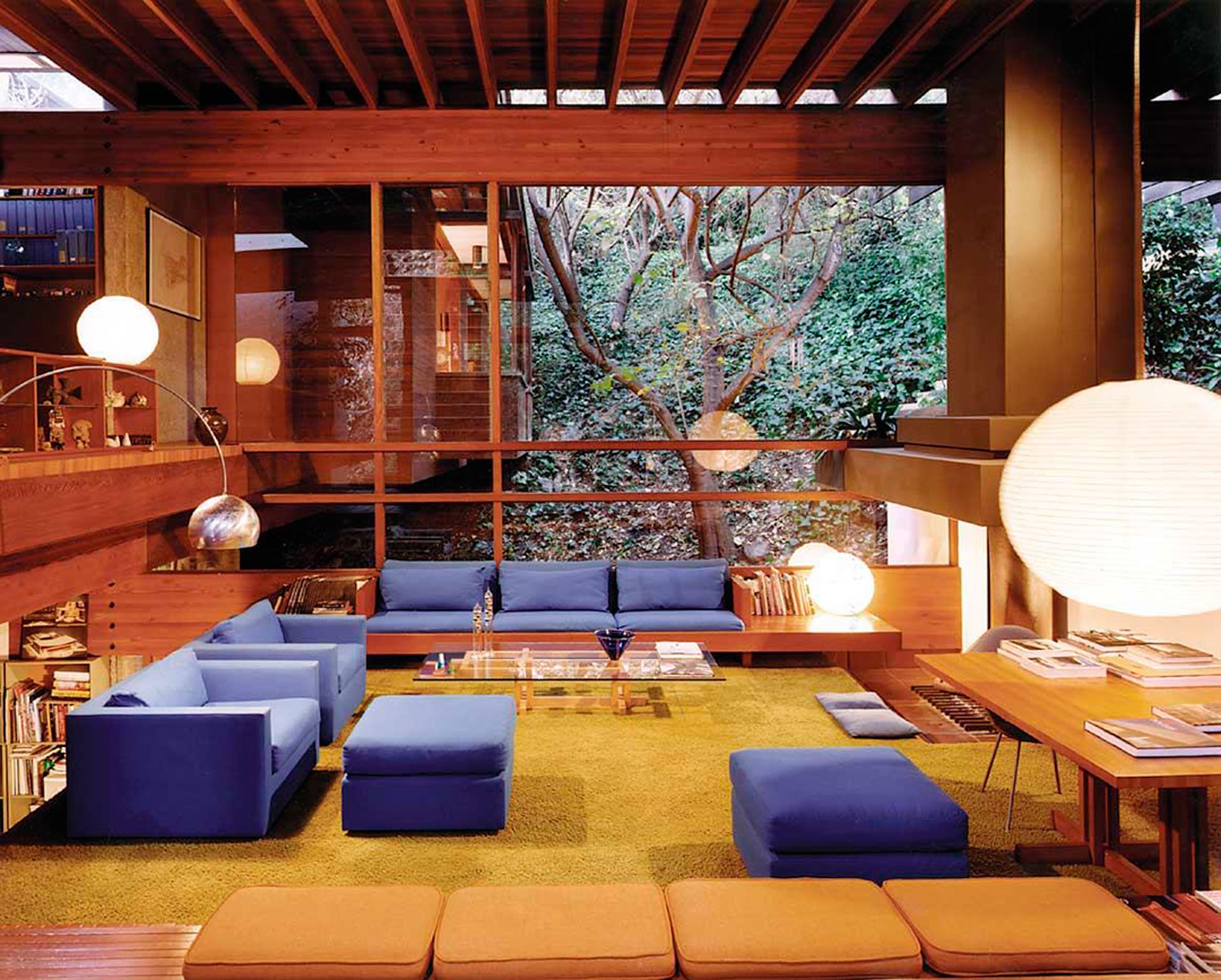 La casa de Ray Kappe se organiza en una serie de plataformas conectadas, donde madera de secuoya, vidrio y hormigón definen una arquitectura ligera a pesar de su complejidad estructural. Las fachadas acristaladas abren el interior hacia el paisaje californiano y permiten que la luz natural recorra los espacios a lo largo del día.