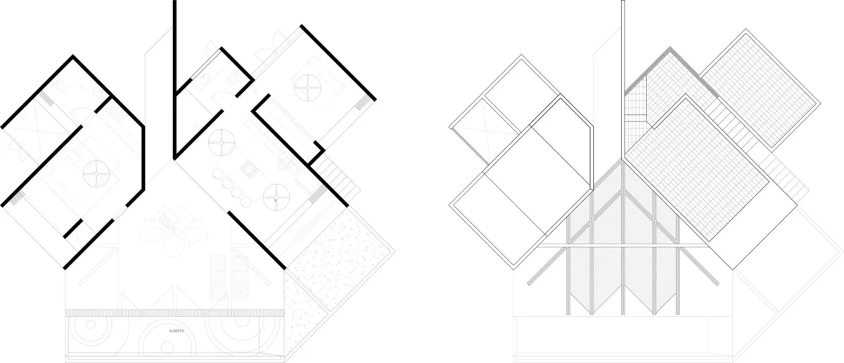 Se parte de dos volúmenes dispuestos en forma de mariposa, lo que genera patios triangulares. Una de las alas se orienta hacia el océano y el amanecer, mientras que la otra se despliega en busca del ocaso. La primera alberga el dormitorio principal, una pequeña cocina y un comedor que conduce a la piscina de horizonte infinito. La segunda cuenta con otro dormitorio y una escalera exterior de peldaños suspendidos para acceder a las dos azoteas.