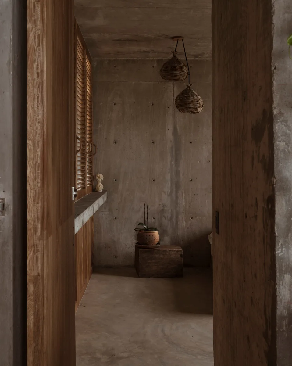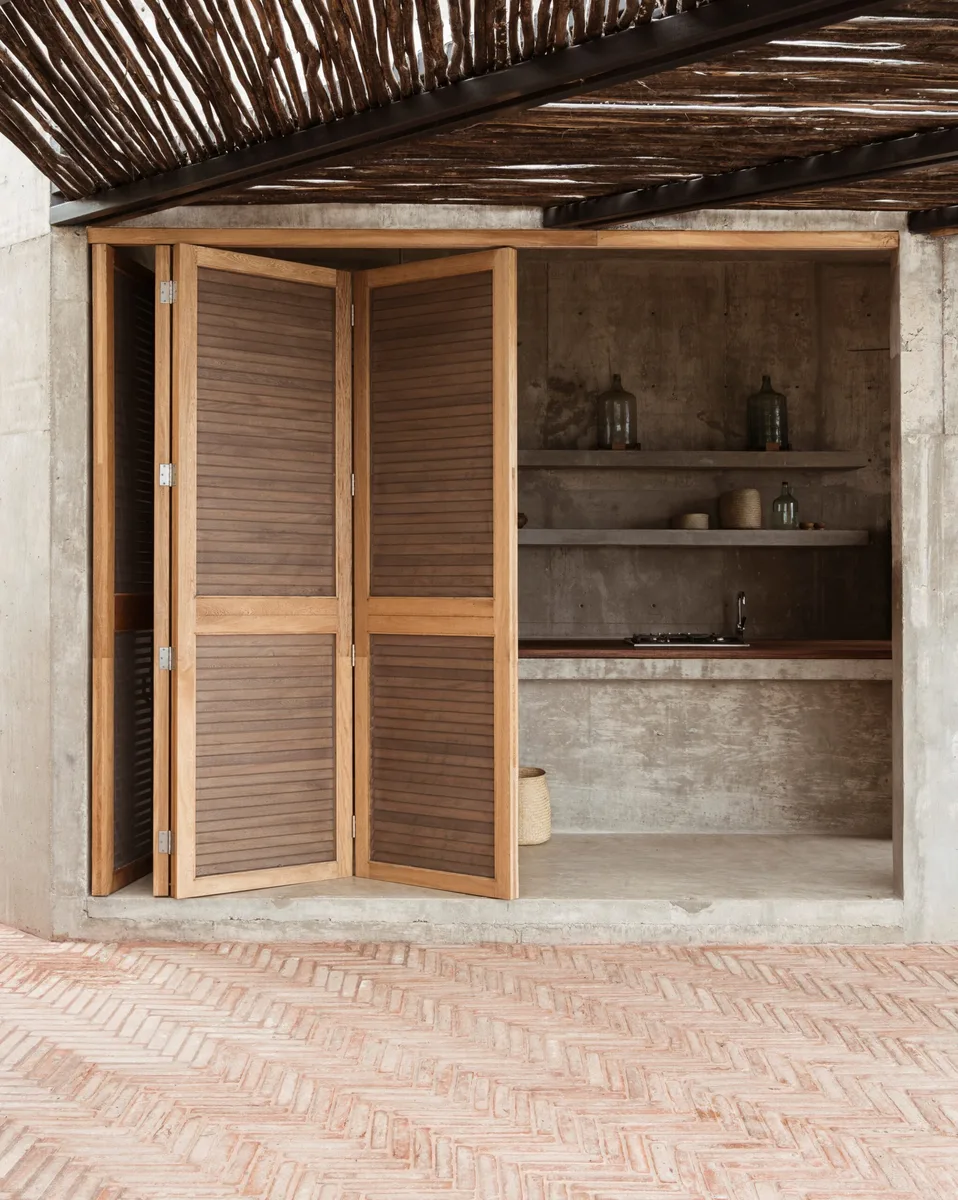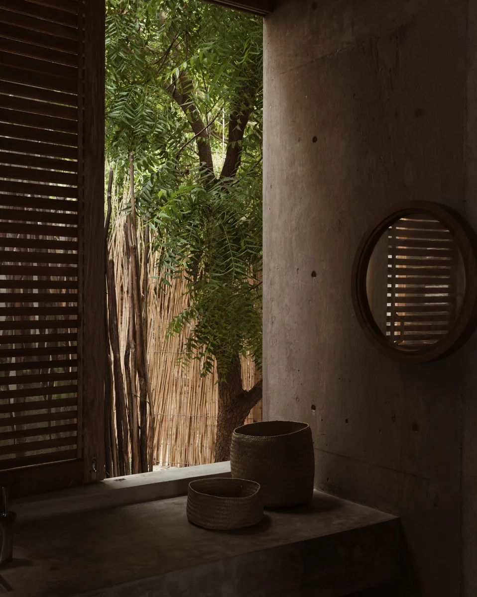 Respecto a los materiales, el equipo prefirió un diseño cálido y austero que se integrara bien en el paisaje mexicano. Por ello encontramos ladrillos de terracota en espiga o en aparejo normal en los suelos de las terrazas, piedras extraídas de un río cercano dentro del hormigón visto sin pulir o puertas de madera local en acordeón que regulan la privacidad y la entrada de luz a la vivienda. Por último, un dosel de acero y ramas protege buena parte del exterior de los rigores del sol.