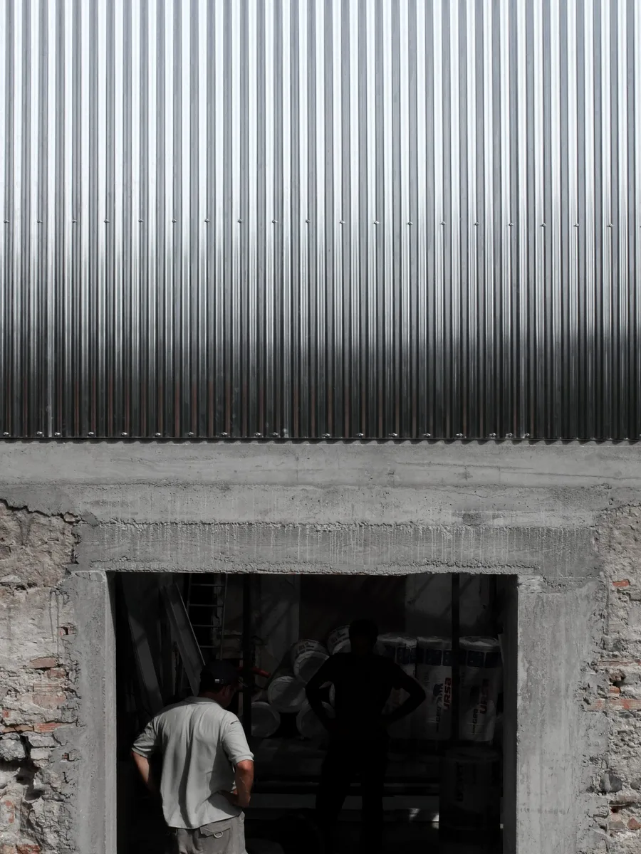 La normativa urbanística de la zona prohibía la demolición del edificio, por lo que se diseñó una ampliación vertical con la que proporcionar una planta extra a los nuevos dueños. Desde un principio se buscó potenciar el contraste, así que se enfrentó la estilización de la chapa ondulada –llena de trazos verticales– con la masividad contundente de la piedra y el mortero envejecido.