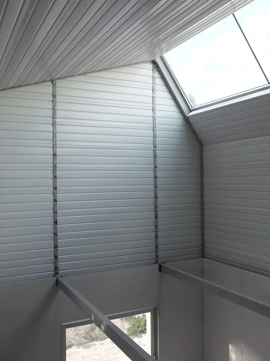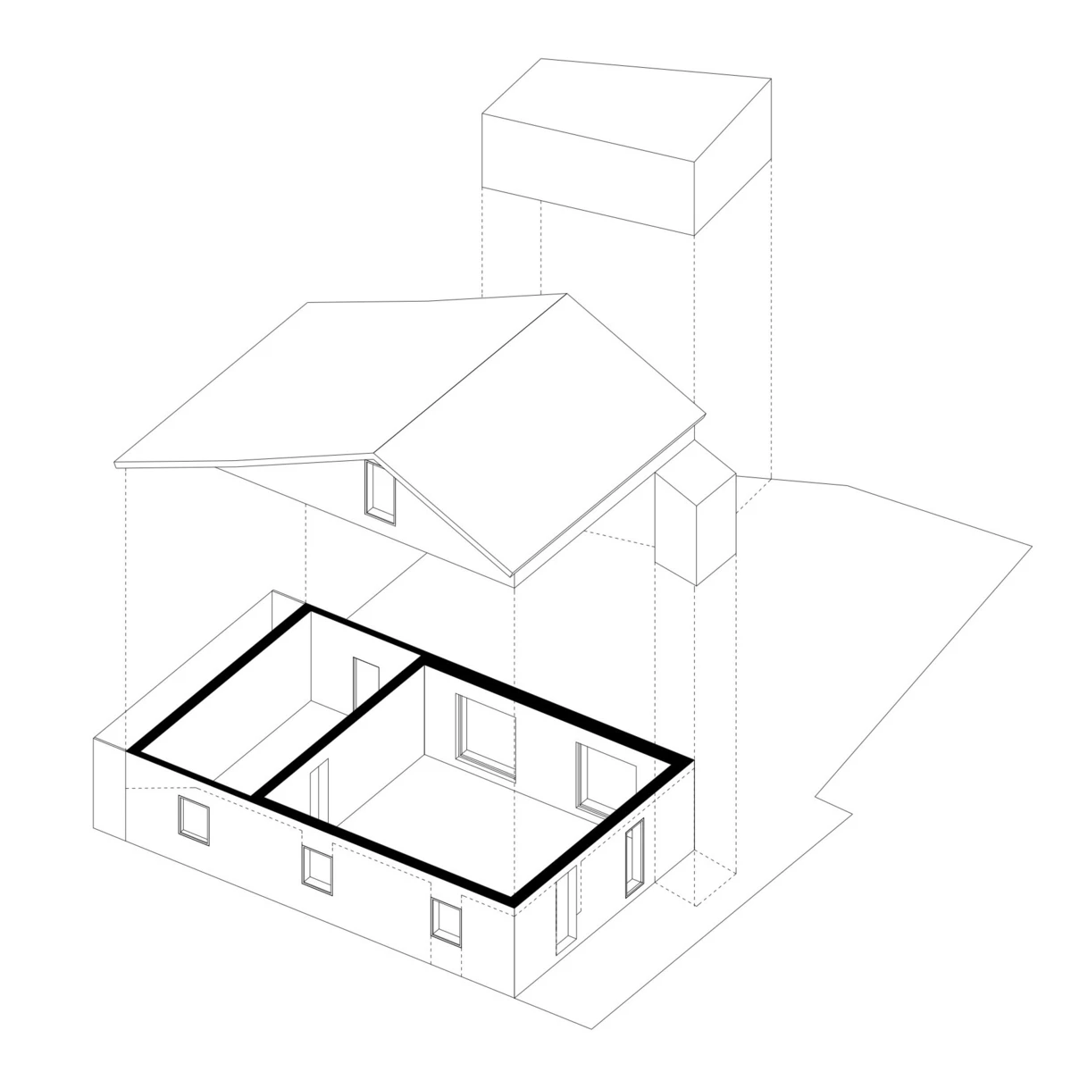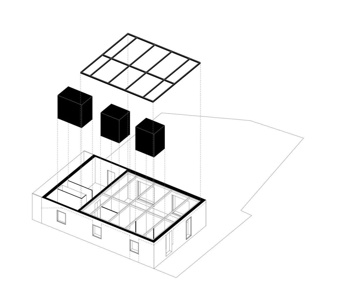 Además, el acero corrugado es resistente pero no sobrecarga los cimientos originales. En cuanto a la iluminación natural, incluye dos pequeñas ventanas en los lados oeste y sur de la extensión, aparte de un lucernario rectangular en el costado norte.