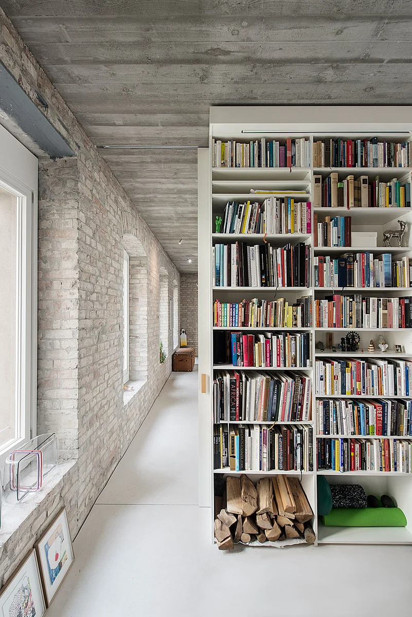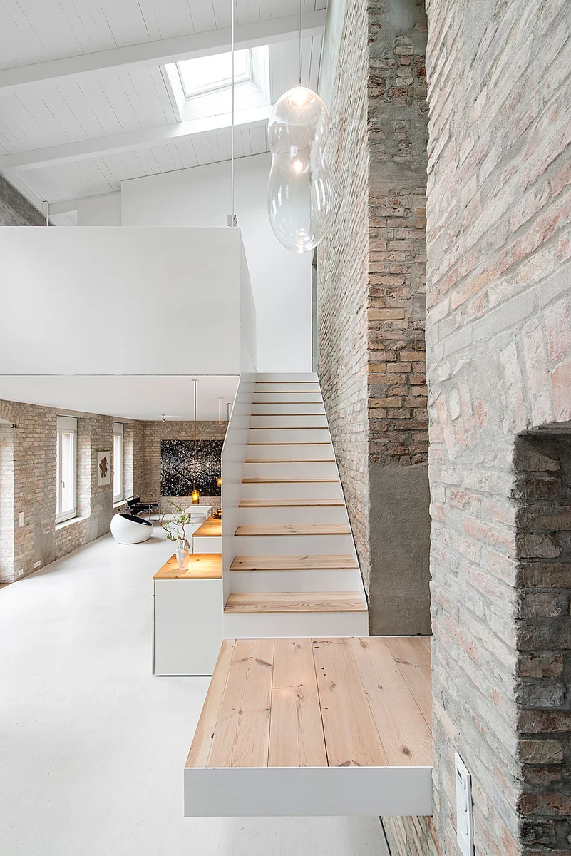 Las viejas paredes de ladrillo patinado dan carácter al interior, mientras la madera de las vigas originales luce ahora renovada en las escaleras y la cocina. Dada la estrecha amistad del dueño con Loeper, el proceso de diseño fue muy colaborativo, dando lugar a abundantes piezas personalizadas. Armarios, persianas, lavabos e incluso la bañera se realizaron a medida para esta Muellerhaus Metzerstrasse Berlin (MMB).
