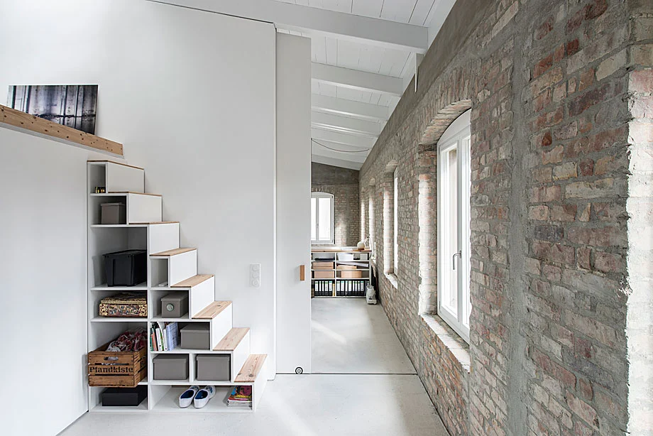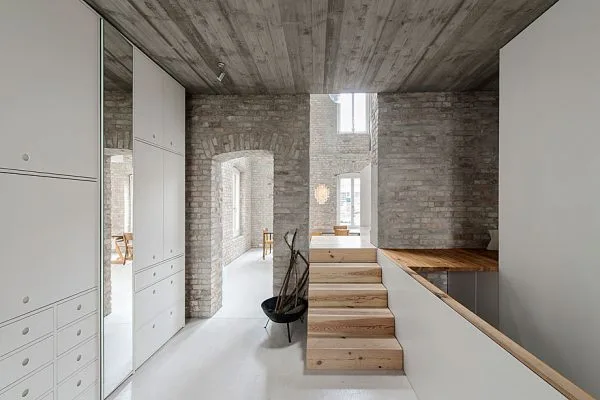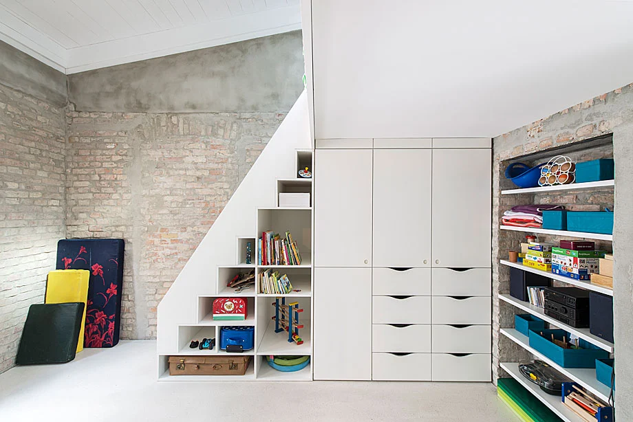 La ambientación interior combina texturas modernas e históricas, aportando varios detalles prácticos, como los elementos de almacenaje bajo las escaleras de acceso a las camas de los niños. Ladrillos, hormigón visto y cálidas superficies lisas se combinan para rejuvenecer con encanto este enclave decimonónico de un Berlín que ya no volverá.
