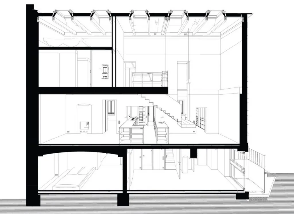 Solventadas las restricciones del planteamiento externo, tocaba dar forma a la distribución interior. Como la casa se había utilizado anteriormente como taller y comisaría, estaba dividida en muchas habitaciones pequeñas. Para adaptarla al uso familiar se demolió todo salvo las paredes exteriores y un muro central de carga.