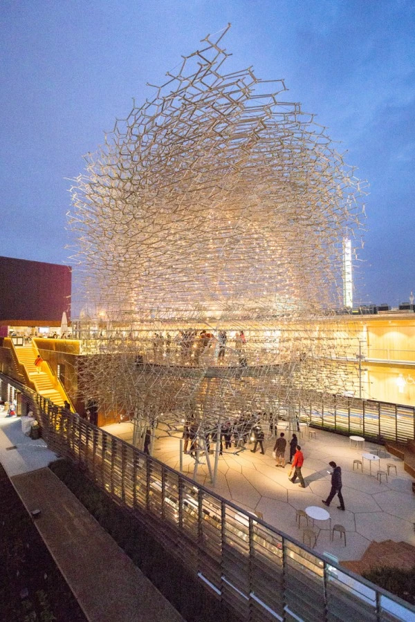 Entre todos los pabellones y países nos hacemos eco en esta entrada de «despiertaYmira»del pabellón de Reino Unido por la originalidad del concepto desarrollado a lo largo del mismo. El pabellón se desarrolla a través de la idea del concepto de colmena. ¿Y por qué una colmena? Parte de dos máximas: la primera, de los 100 tipos de cultivos que existen y que suponen el 90% de la comida a nivel mundial, 70 son polinizados por abejas, la segunda, las abejas son el mejor ejemplo de insectos conscientes que dependen las unas de las otras para su supervivencia. Nos pone en sobre aviso de la importancia de las abejas (población en receso los últimos años) en nuestro ecosistema y la fragilidad del mismo.