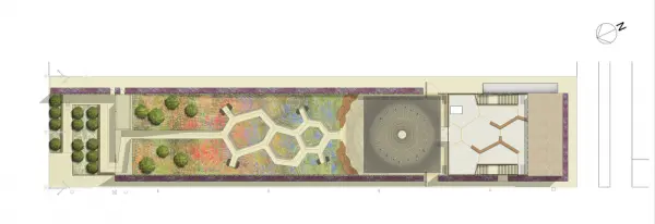 El pabellón recrea lo que pudiera ser el recorrido de una abeja atravesando diferentes escenarios hasta llegar a la colmena. El recorrido se inicia en un patio de arboles frutales pasando posteriormente a una campiña de flores silvestres que desemboca en una impresionante escultórica colmena de 14 metros formada por un auténtico enjambre de barras de aluminio y acero.