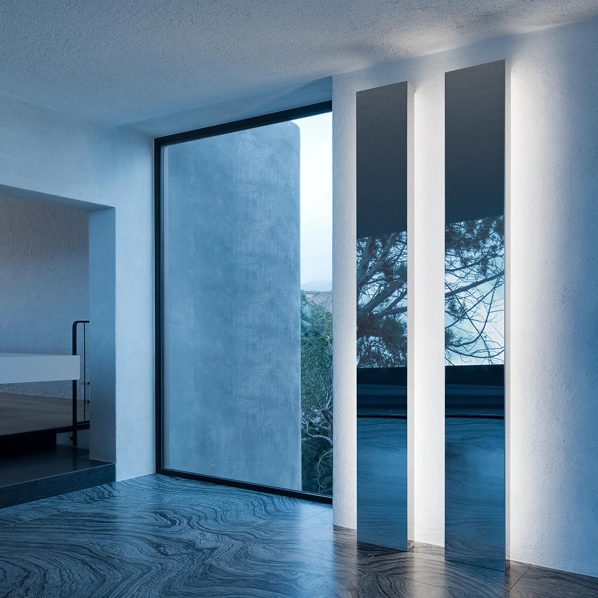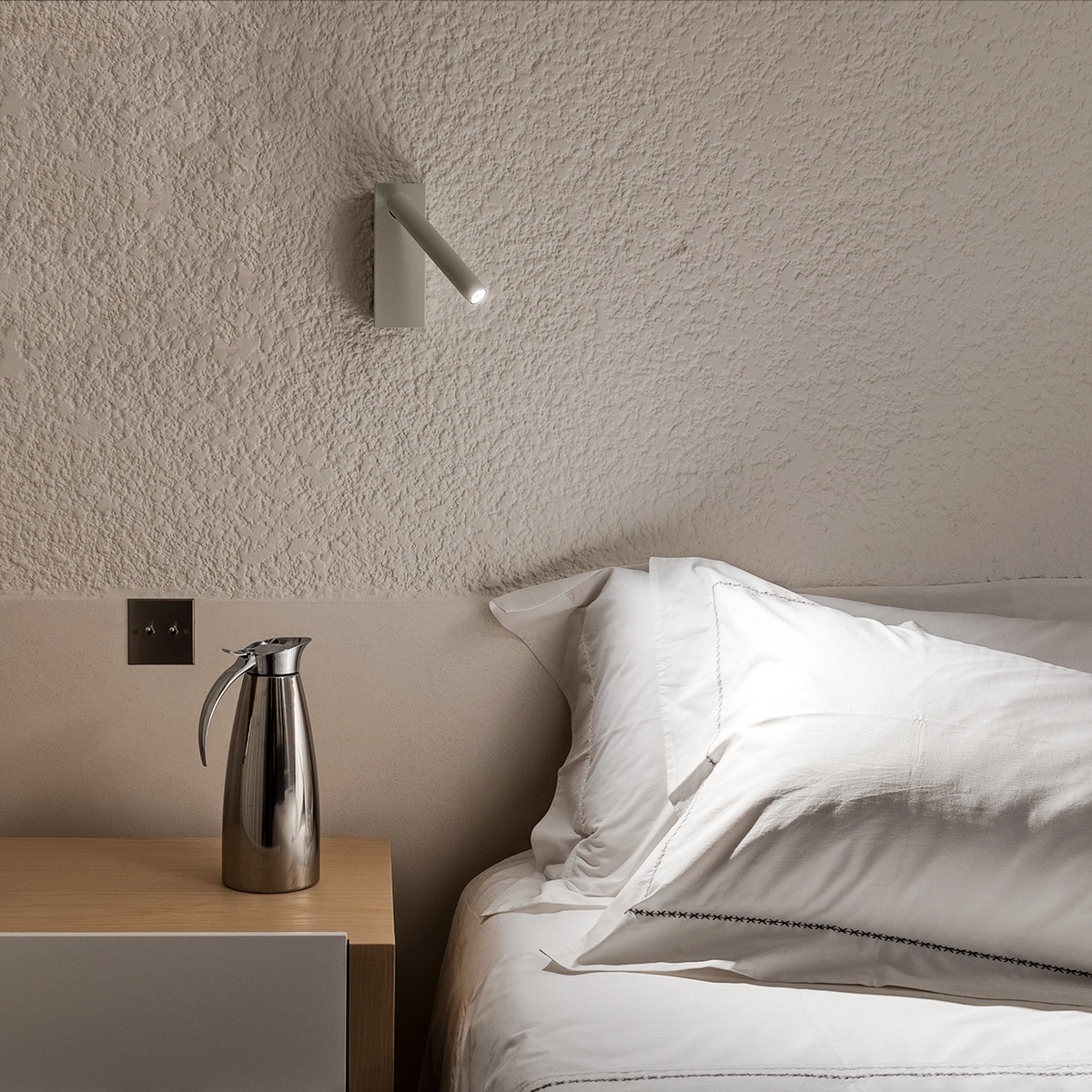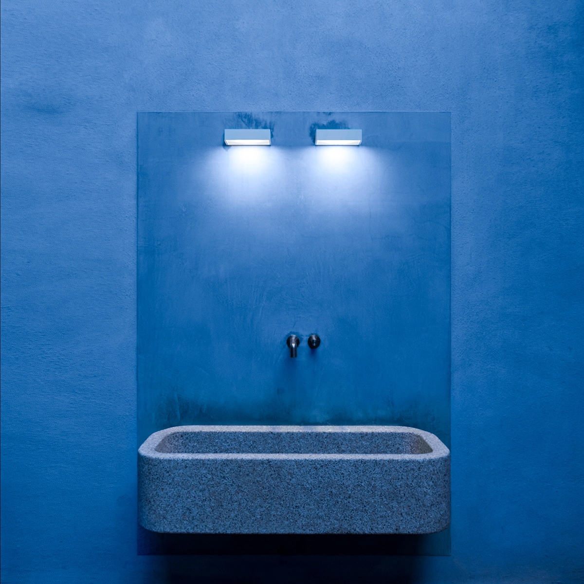 Por su parte, en el dormitorio principal, el dúo de luces fluorescentes Banner proyecta suaves columnas blancas para recibir la caída de la tarde. Allí encontramos también el aplique orientable Mira, de espíritu minimalista. Una sobriedad que tiene su continuación en los baños, donde las lámparas Juliet ceden su protagonismo a la pila de granito.