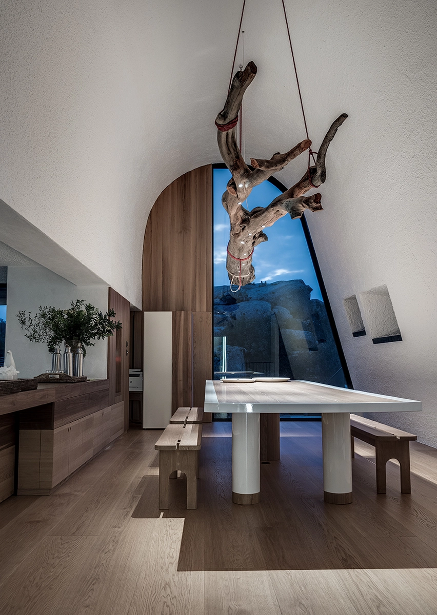 La Grintosa tiene vocación de escultura con sus paredes curvas y cierto aire dramático, así que la decoración nocturna debía potenciar esa magia, aderezada con mármoles, colores pastel y azulejos firmados por la propia Stera. Resultaba, pues, esencial un buen trabajo de iluminación, que corrió a cargo de la firma Davide Groppi y en el que destaca la espectacular lámpara de comedor: una pieza única elaborada con un tronco de enebro recogido en la playa.
