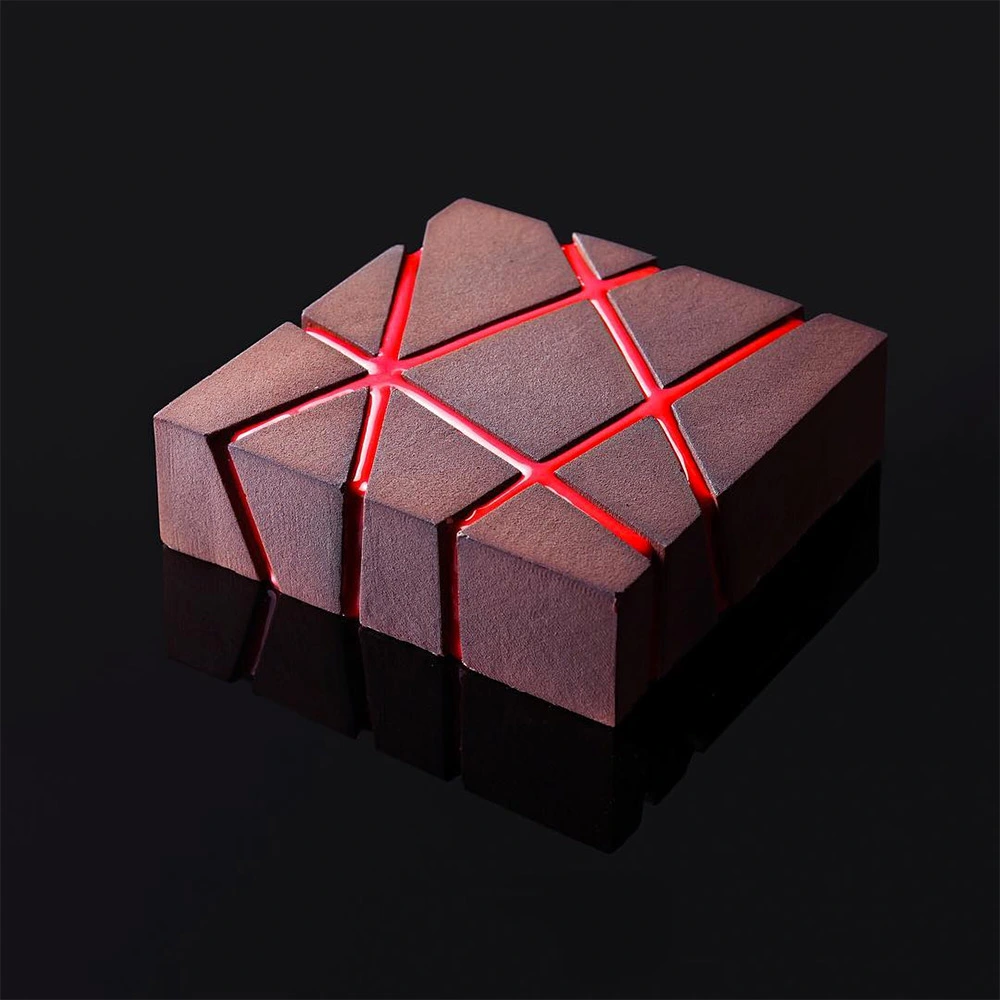 Con la geometría como leitmotiv, Dinara combina chocolate, nata, bizcocho, masa quebrada, merengue y numerosas gelatinas y confituras para crear verdaderas delicias visuales.