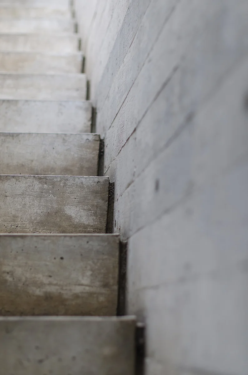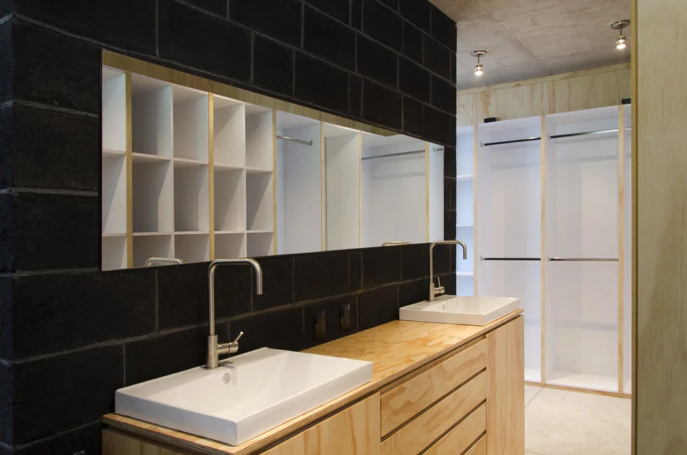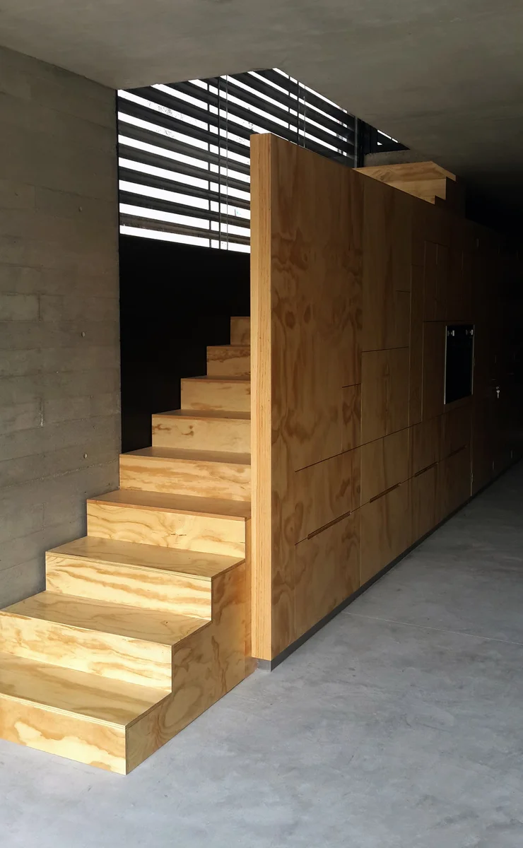 Respecto a la estructura, el cuerpo principal del edificio se construyó en hormigón visto, de modo que el encofrado en madera dejase su impronta decorativa en todas las paredes. Las conexiones entre niveles se realizan mediante tres tramos de escaleras, uno en el patio y dos dentro del edificio, alternando la madera de pino, la piedra y el hormigón negro. Los huecos bajo las mismas se transformaron en armarios empotrados y en una librería, optimizando así el espacio de almacenamiento.