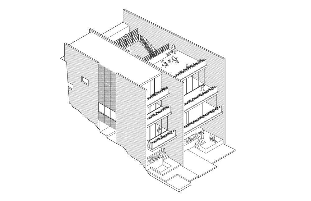 La ubicación presentaba sus propias dificultades, ya que el espacio estaba rodeado por una pared rocosa al fondo y por propiedades vecinas a ambos lados. Así pues, el desafío era grande a priori. Sin embargo, los arquitectos plantearon un desarrollo en cuatro niveles adaptado a la peculiar topografía del área, con un patio interno colocado entre la roca y la parte posterior de la vivienda.