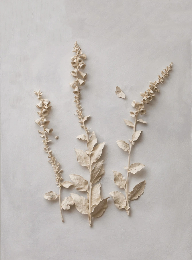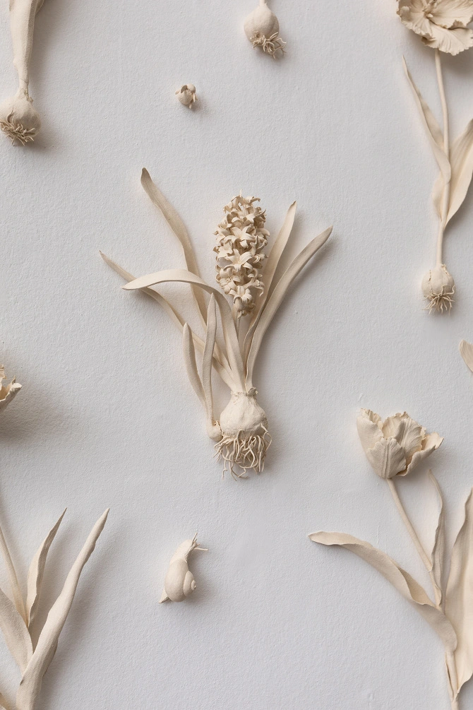 Kaori moldea a mano sus creaciones en gres blanco –procedente del área de Stoke on Trent– y las lleva al horno sin esmaltar, alcanzando una precisión asombrosa. Como modelos, emplea flores y plantas de temporada, muchas de ellas cultivadas en su jardín del sur de la ciudad o recogidas en un parque cercano. Esta pasión por el mundo vegetal es una herencia de su abuelo, otro jardinero entusiasta.